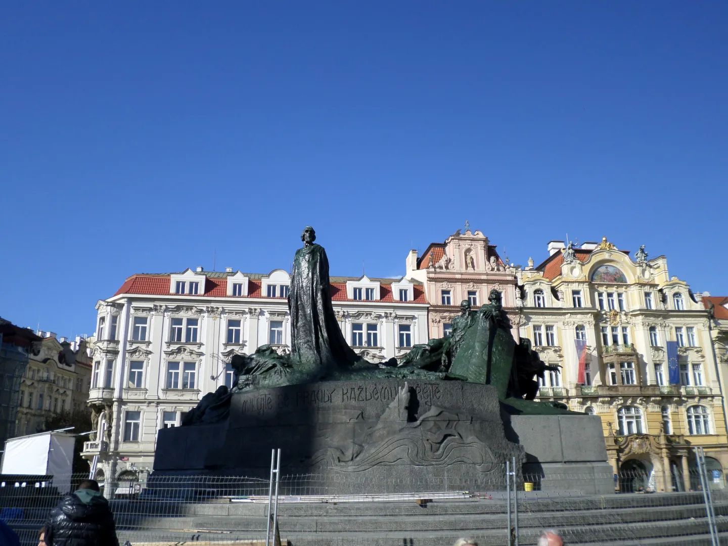 Jan Hus, religious reformer immolated for his opinions at the Council of Constance, in 1196, The central figure of Master Hus is surrounded by a group of statues symbolizing « the fighters of God » inaugurated in 1915, was the opposite of the Catholic symbol represented by the column Baroque Marian church which was located in the center of the square The memorial is an imposing rock, can’t missed it.