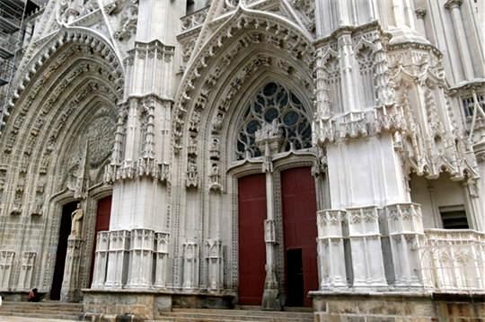 The construction of a sumptuous cathedral, reflecting the power, prosperity and ambitions of the duchy of Brittany, is fully in line with a new project. It was launched in 1434 by Duke Jean V and Bishop Jean de Malestroit. The frontispiece is made up of three portals decorated with decorations illustrating biblical scenes and characters. It is framed by two side portals dedicated to Breton saints: Donatien, Rogatien and Yves de Tréguier. Around 1520, the construction site was interrupted, due to a lack of financial means. At the beginning of the 17C, the construction site resumed, motivated by the reform of the Catholic Church and of the liturgy recommended by the Council of Trent. In 1626 the covering of the nave ,and the southern part of the transept 1642 were completed. The latter is pierced by a portal in its southern part which allows processions to cross the cathedral from south to north. A rood screen is high to hide the junction between the Gothic nave and the Romanesque choir. In the 18C, the vaults of the Crypt were destroyed in order to lower the level of the Romanesque choir. The space for the canons is thus enlarged and the faithful are closer to the altar.