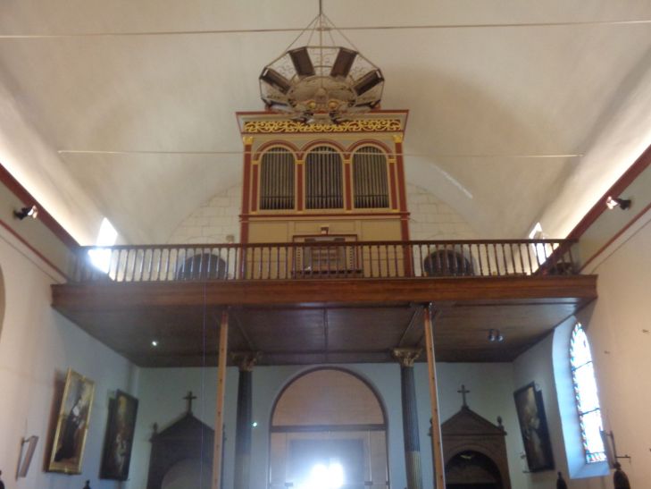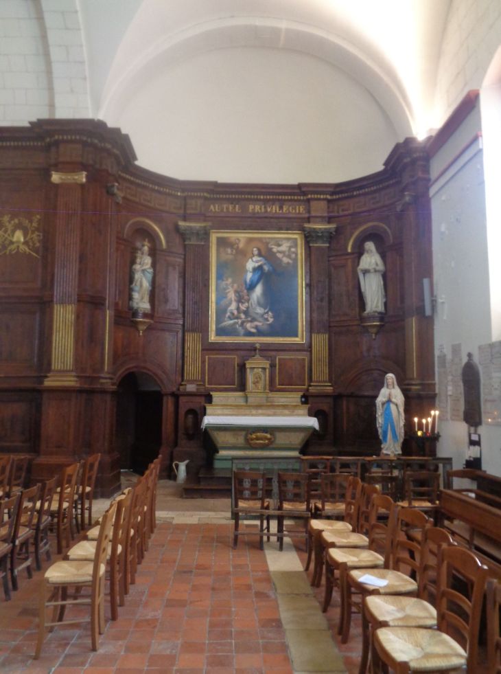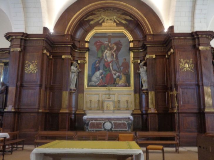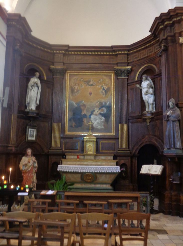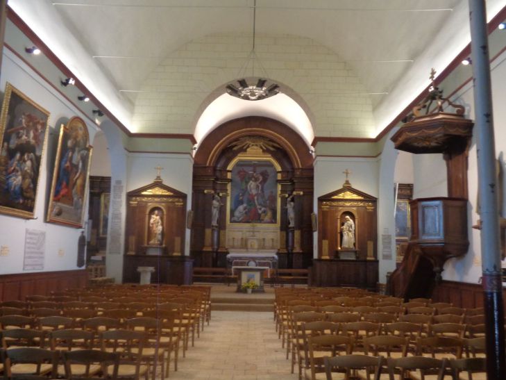 It has a simple nave on a rectangular plan extended by a square choir ending in a flat chevet. Two side chapels to the choir, arranged symmetrically to the east and west, complete the church. A vestibule, whose walls support the bell tower, is located at the entrance to the nave. The woodwork that adorns the walls of the choir is made of oak veneered with mahogany and decorated with gold leaf; the same principle is applied to the columns which, at the entrance, support the organ gallery , Along with the building itself, six paintings of : a Virgin and Child with Saint John the Baptist (17C) after Anton Van Dyck, a representation of Saint Charles Boromea (17C) after Charles Le Brun, an oil on canvas depicting Saint Angela (1769), an Adoration of the Magi (17C or 18C) after Simon Vouet, an Annunciation (17C) and a depiction of the Holy Family (17C) after Pietro da Cortona, a portrait of Saint Angela by Madame Mauzay,