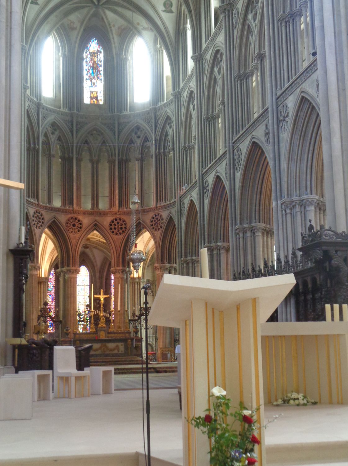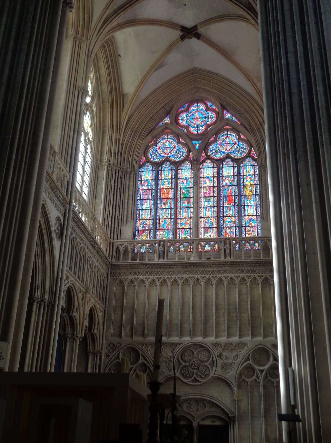 Dating from the 1220s-1240s, the choir derives from that of the Abbey of Saint-Étienne in Caen (see post). It comprises three levels with four bays opening onto a roundabout: that of the large arcades, that of the triforium, which corresponds to a highly decorated circulation gallery, and the level of the high windows. Among the features depicted are Adam and Eve, the Annunciation, two bishops subduing a wolf and a dragon, probably Saint Loup and Saint Vigor, a woman and a man grappling with monsters, probably allegories of temptation. The vaults are decorated with medieval paintings depicting the first bishops. The splendid goldwork decoration, the cross, and the six gilded bronze candlesticks. The stalls date from the 16C. Reclining lions are installed at the end of each row of low stalls. Their current layout dates back to 1861; its woodwork reproduces the Renaissance motifs of the stalls. The side railings date from 1682 and those of the roundabout from 1772.