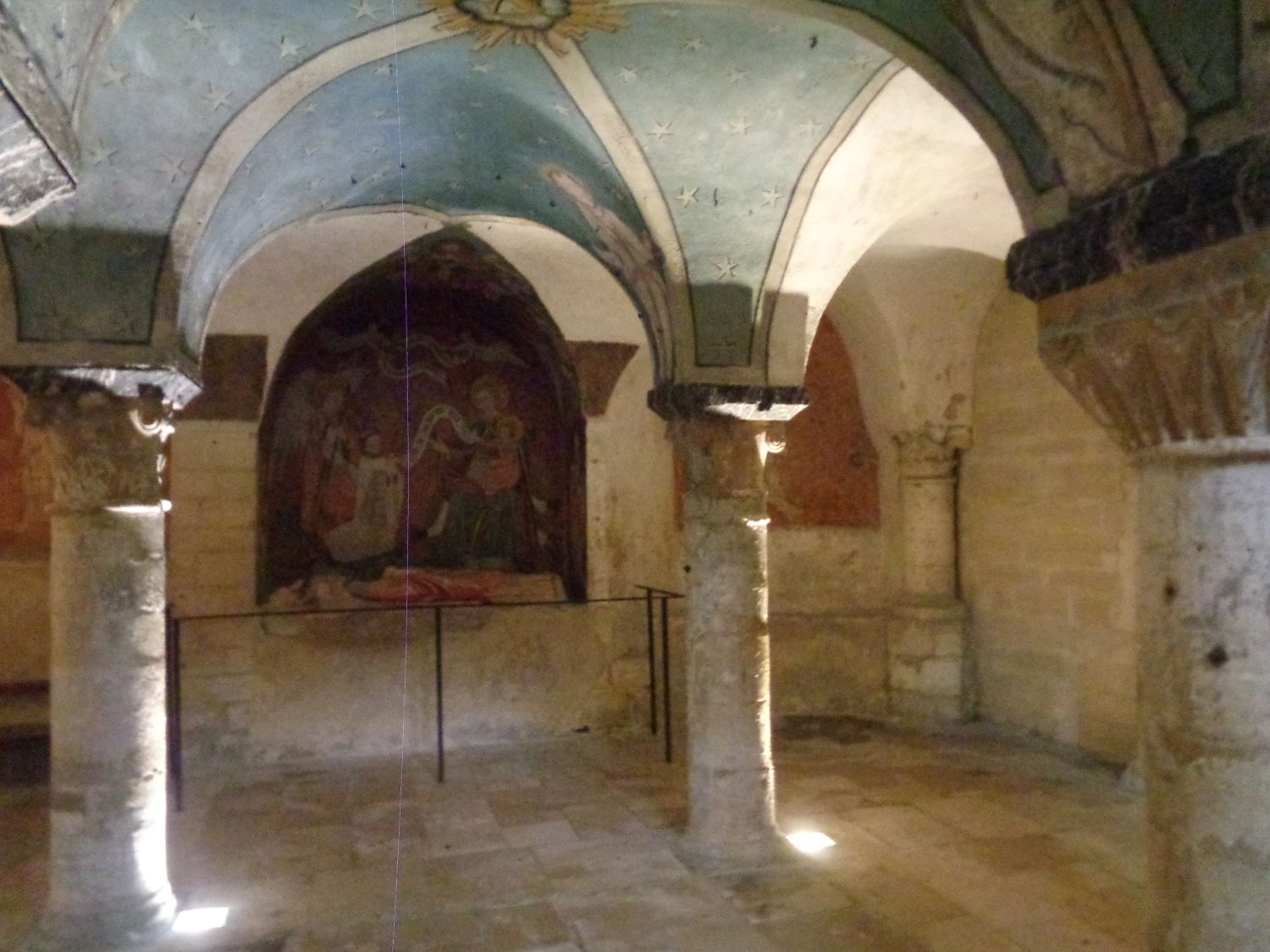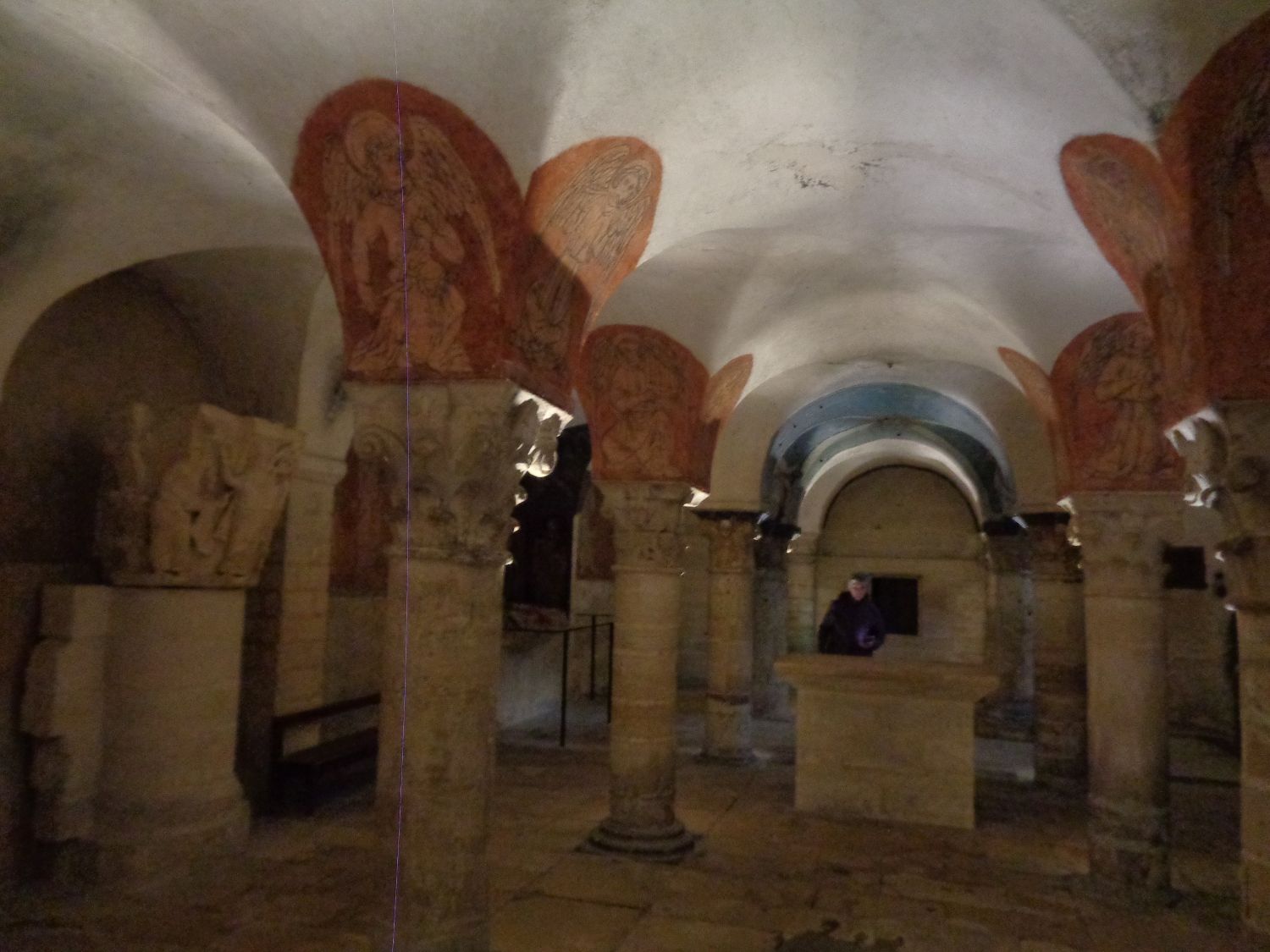 The crypt dates from the 11C, therefore from the first construction of the cathedral. The pillars have capitals decorated with acanthus leaves. The crypt also contains two historiated capitals from the 11C discovered during restoration work. During the construction of the Gothic choir in the 13C, the Romanesque crypt was walled up. For a century, it fell into oblivion. It was rediscovered and reopened in 1412, on the occasion of the burial of the Bishop of Bayeux, Jean de Boissey. A large bay was pierced on the south side, under which the base of his tomb and his epitaph remain. The decorations, such as the frescoes of the musician angels above the capitals of the pillars, date from the 15C, shortly after, it seems, this reopening. On the north wall is the tomb containing the decapitated recumbent figure of Gervais de Larchamp, canon of Goupillères in 1405.