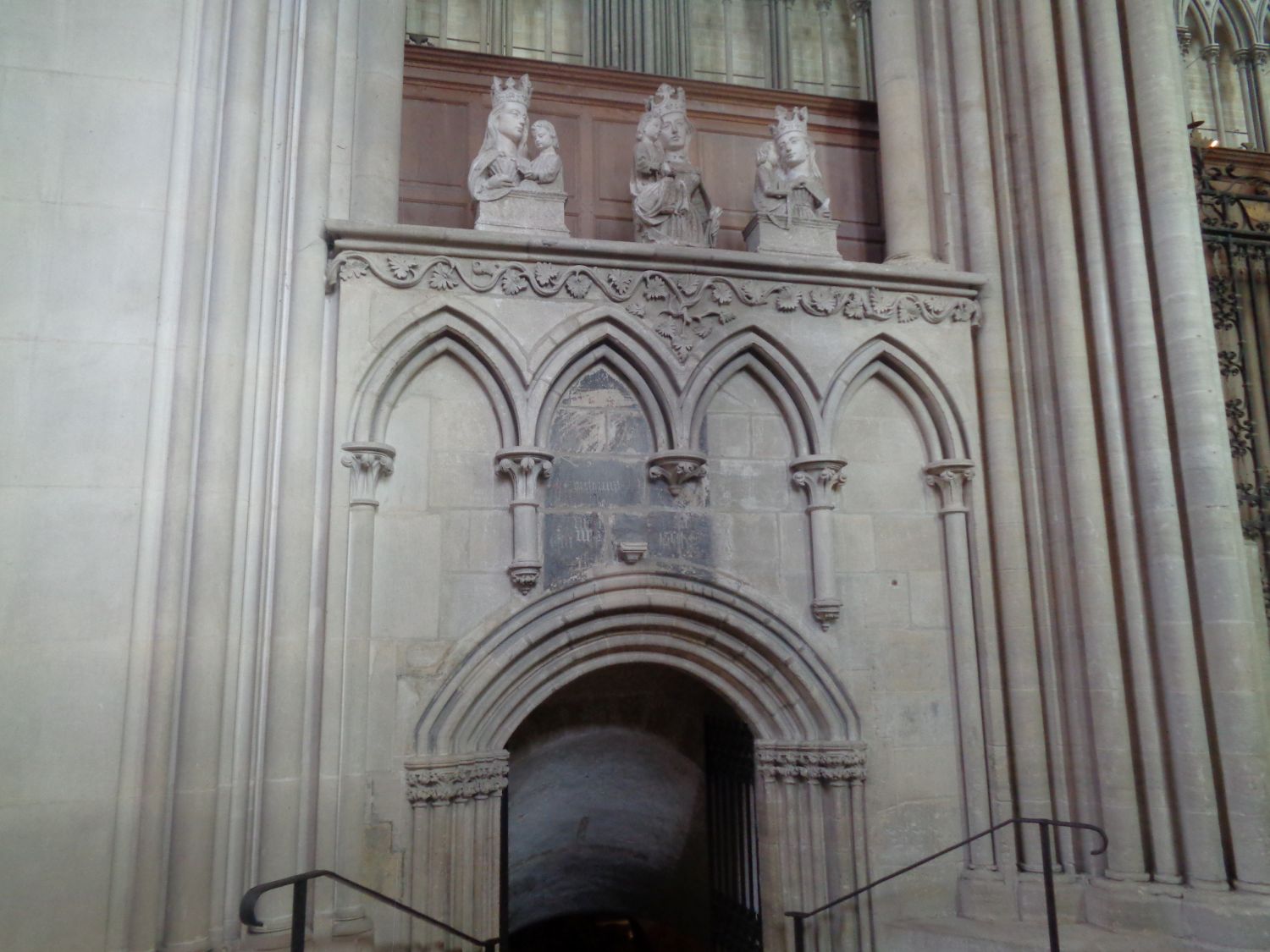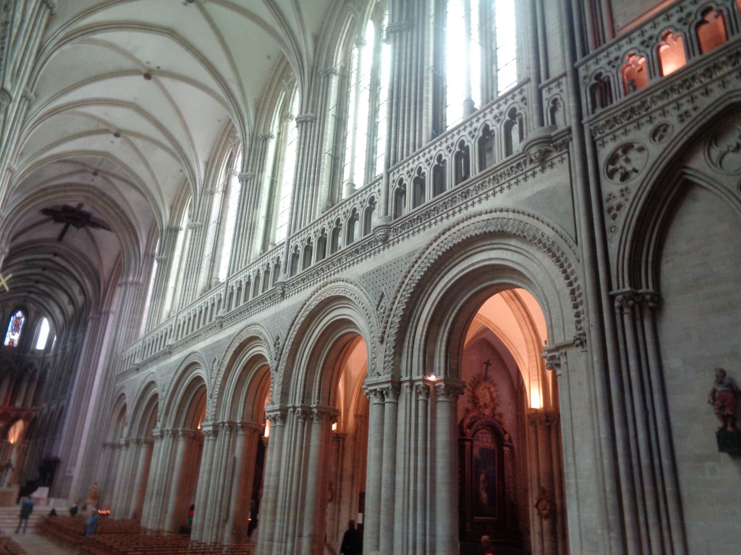 The Notre Dame Cathedral, narthex has two bays: the first is occupied by twin blind arcades, the second by an organ gallery. The nave has two levels: the large Romanesque arcades of the lower level date from the 12C, while the upper level, in Gothic style, dates from the 13C. The large arcades are surmounted by the single Gothic floor, designed by the architect in the mid-13C. It is separated from the Romanesque level by a quatrefoil frieze characteristic of Norman Gothic art. On the left side of the nave, we can see the gallery of the medieval organ, destroyed in the 16C.