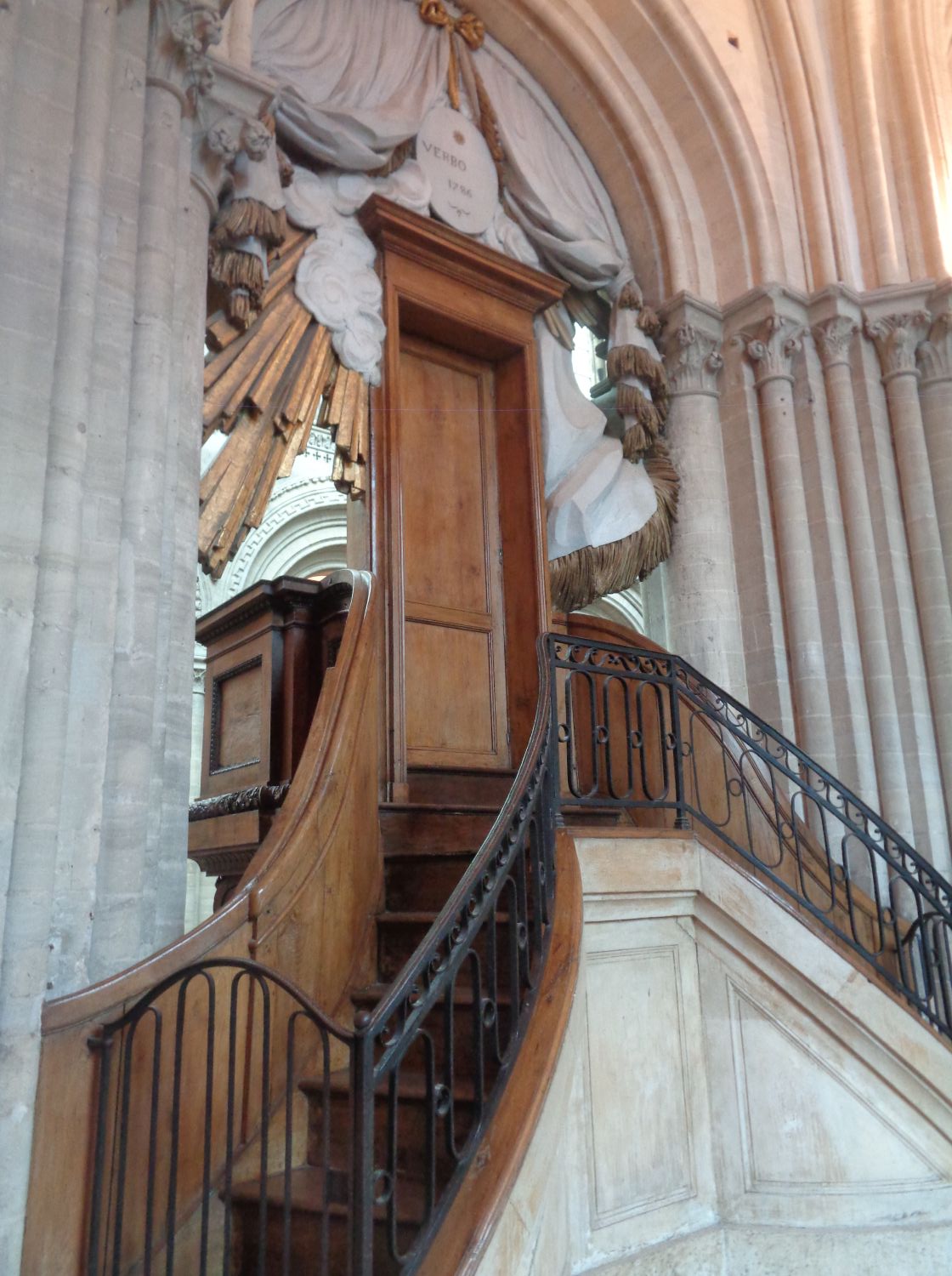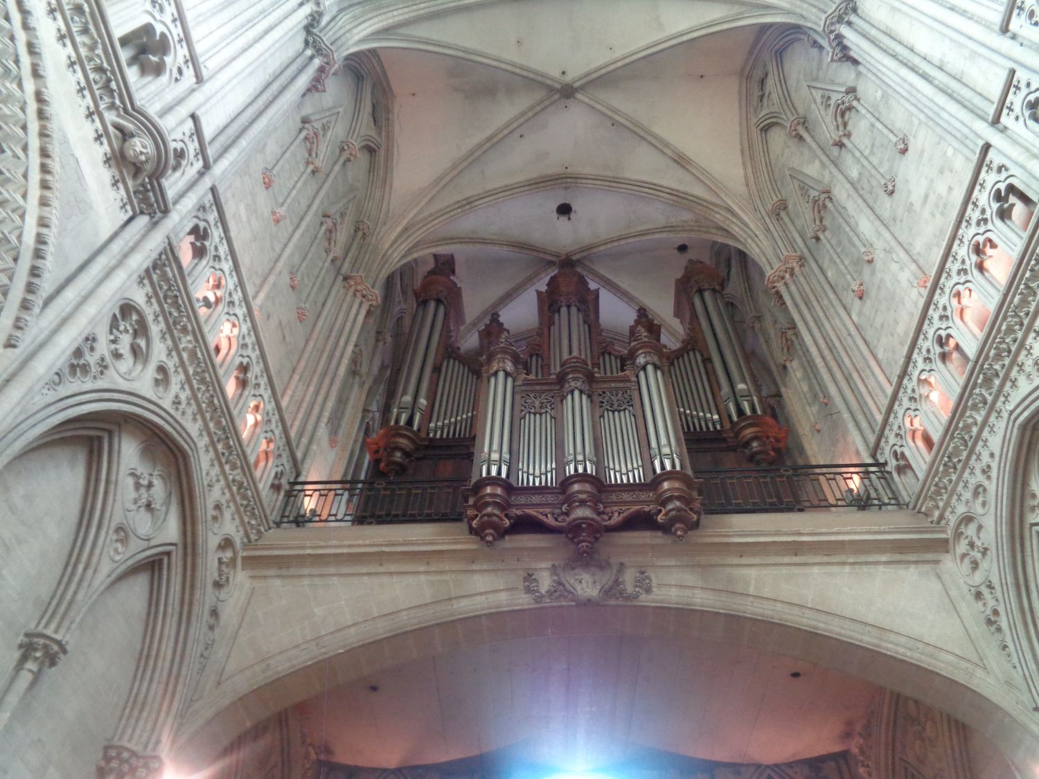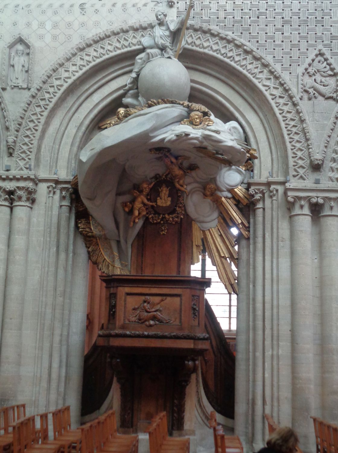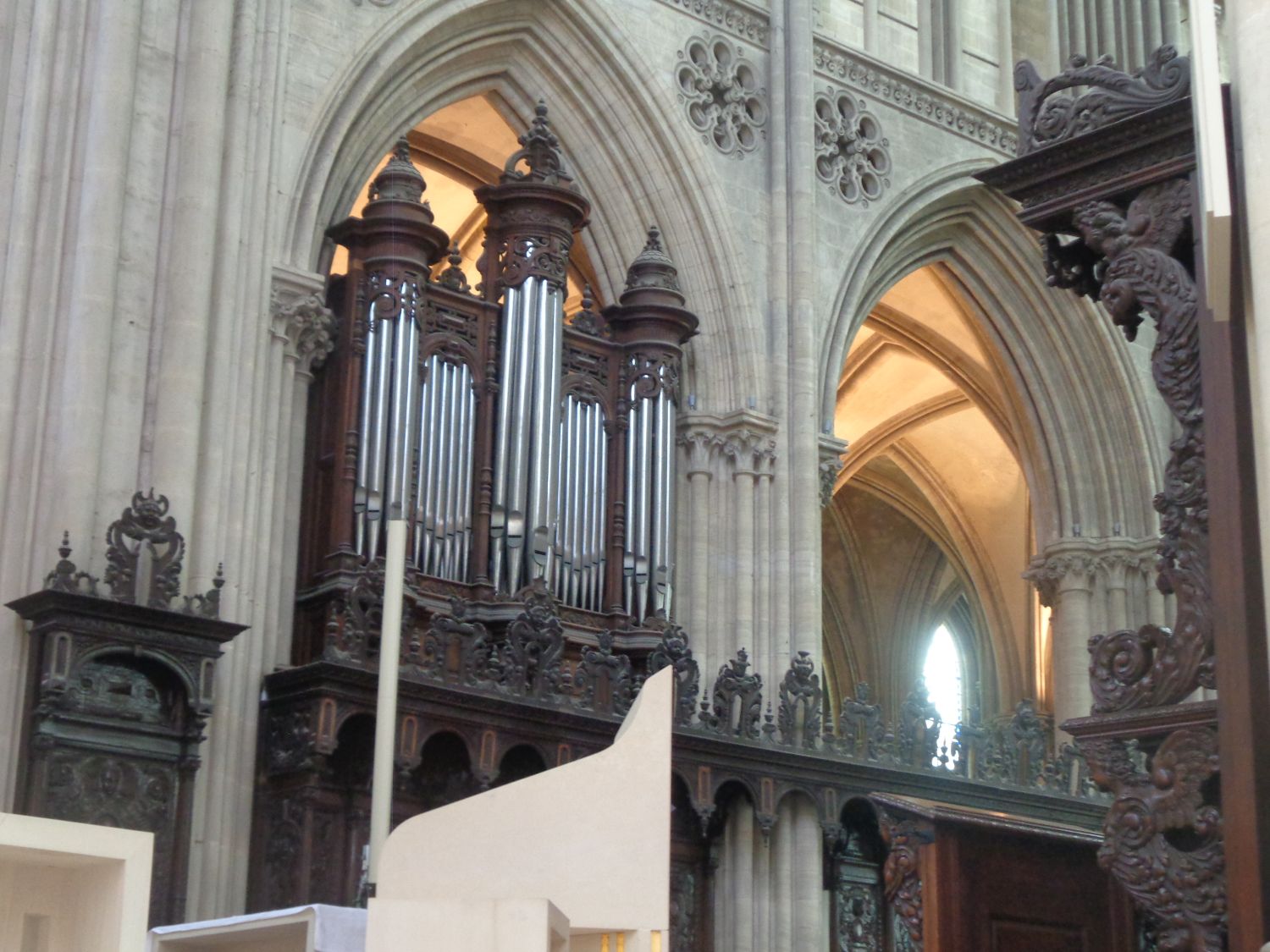 The tribune organ. The case was rebuilt and enlarged by Le Breton de Caen from 1845 to 1848, reusing elements of the 1597 case. Further modifications were made in 1862 by Aristide Cavaillé-Coll, whose organ, restored by Renaud-Ménoret from 1996 to 1998, is the one we see today. The choir organ. Built by Aristide Cavaillé-Coll in 1861, the case was designed by Michel Liénard. The organ chamber is Neoclassical, and the upper part is Baroque. The lampshade is formed by a cloud sheltering stucco cherubs, surmounted by a globe bearing an allegory of religion brandishing a cross.