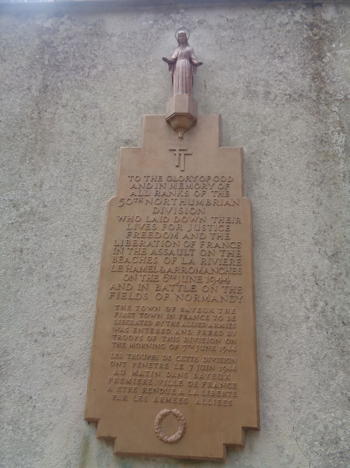 « To the glory of God and in memory of all ranks of the 50th Northumbrian Division who laid down their lives for Justice, Freedom and the Liberation of France. In the assault on the beaches of La Rivière, Le Hamel and Arromanches on the 6th June 1944 and in Battle on the field of Normandy. The town of Bayeux, the first town in France to be liberated by the Allied armies was entered and freed by troops of this division on the morning of 7th June 1944 » The 50th Northumbian Division had landed on Gold Beach.