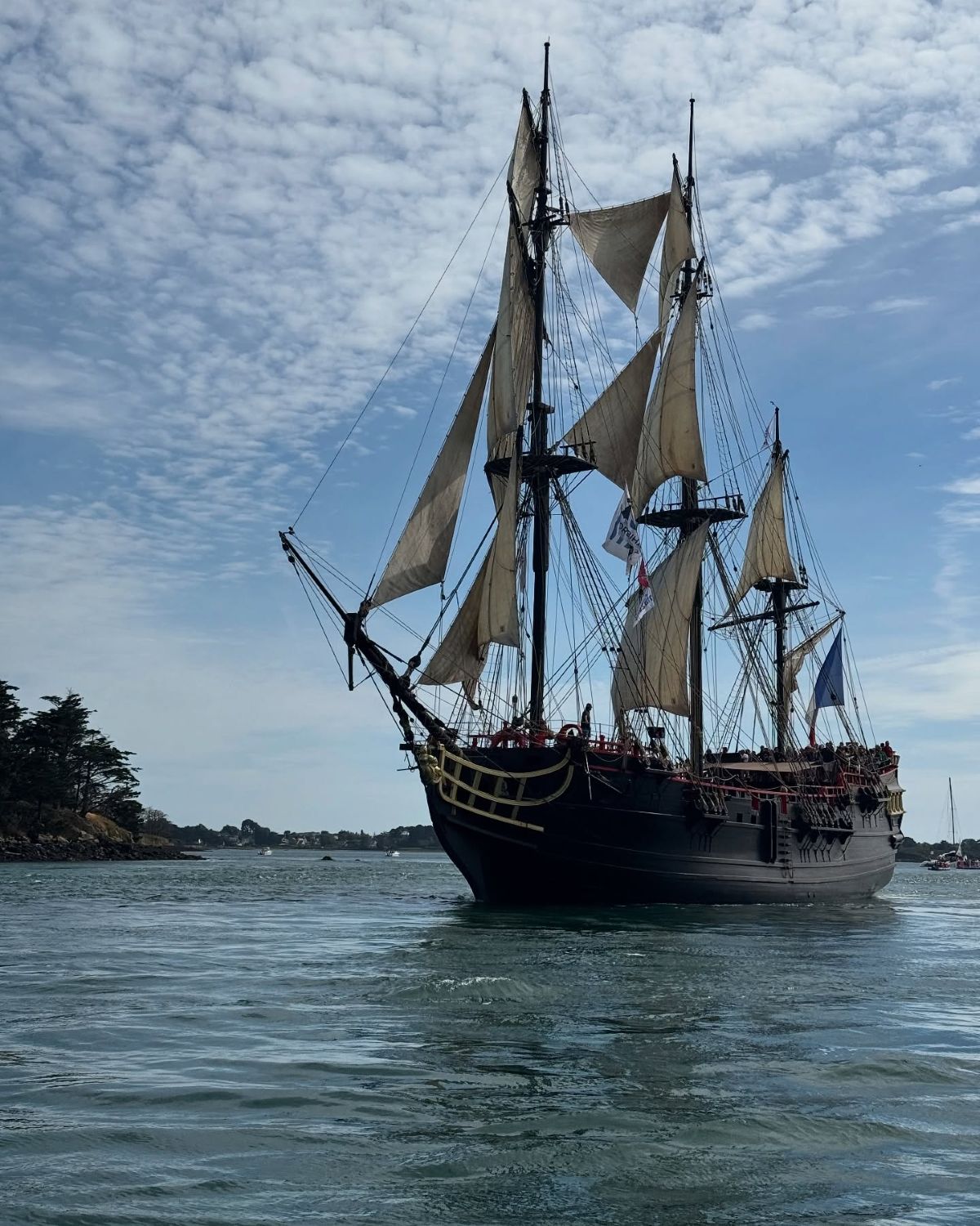 Two boats stands out, me think, and got them afar but pretty pictures, me think, The first one was the Phoenix ,a brig built in Denmark in 1929. It,also, bore the names Anna, Palmeto, Jørgen Peter, Karma, Skibladner, Adella, and Gabriel. It was refitted for the film industry at the Charlestown Harbour shipyards in the United Kingdom. A reconstruction of an 18C Danish ship, it began its career as a schooner for a Danish evangelical mission. In the 1950s, and became a North Sea coaster. In 1974, it was converted into a brigantine and then acquired in 1988 by The Square Sail Fleet, which also owns the Earl of Pembroke and the Kaskelot. This fleet has been carefully rebuilt for use in film shoots. In 1991, the Phoenix became the 15C carrack Santa Maria during the filming of the Anglo-French-Spanish film 1492: Christopher Columbus (1992), directed by Ridley Scott. The ship was known as Santa Maria until 1996, when it reverted to the name Phoenix. The Phoenix relinquished its Danish flag to French in April 2024, and its home port was relocated from Charleston, Cornwall, to Port-Haliguen, Quiberon 56!.right down from me !