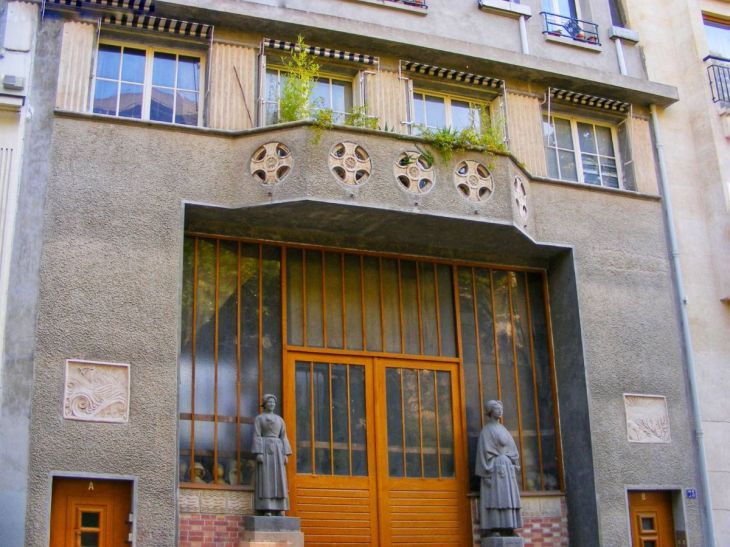 The Atelier of René Quillivic, 73 Avenue de Montmorency, 16éme arrondissement or la maison aux statues or the house of statues done in 1925, Built for the Breton sculptor René Quillivic the facade on the street is a manifesto of the Breton origins of the artist and his sculptor status. It is decorated with bas-reliefs in molded cement, representing on one side the fish and the earth and, on the other, the boats and the sea. The figures of Ploaré and Audierne stand on each side of the entrance to the workshop. René Quillivic was born in Plouhinec in Finistère no 29 Brittany in 1879 , and began his sculptor training, without anything predestined him, at the carpenter workshop in his village. Already, before the Great War or WWI, he knew the funeral commemoration. But it is especially in the context of the Great War or WWI that he became one of the most famous sculptors in Brittany. Almost all of Quillivic’s commemorative monuments are located in Finistère.