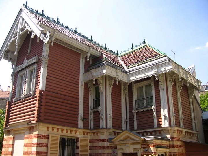 The Isbas of the villa de Beauséjour are a set of four pavilions located in the 16éme arrondissement of Paris near the Jardin de Ranelagh (see post), The Isbas came from the Russian pavilion of the Universal Exhibition of 1867. One of the datchas was built by Russian carpenters in Saint -Petersburg, provided in spare parts for the exhibition and returned once again in 1872 to the villa of Beauséjour. The other three are brick and stone pavilions coated with wood recovered from the exhibition buildings. The Isbas are traditional Russian residences resembling our chalets , This set was sold in 1881 to the widow of Isaac Pereire. Indeed, it was more profitable for the exhibiting nations to sell their pavilions rather than bringing them back to their country, where it was a common building, The Isbas of the villa de Beauséjour, however, remain relatively unknown, because of their location in the heart of a private road at 11bis Boulevard de Beauséjour, Permission was granted for the pic below,