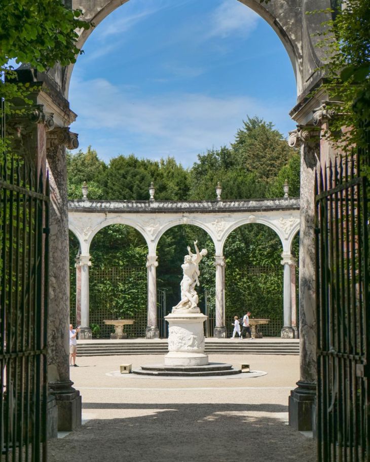 The bosquet de la Colonnade was created from 1678, thought of like a simple greenery room, André Le Nôtre enhances it by adding an existing stream, in order to create a grove with streaming winding among nine small islands. At that time, the grove took the name of bosquet of sources. In 1684, Jules Hardouin-Mansart completely changes the grove, creating a double peristyle with the arcs. The colonnade , name adopted for construction ,originally included 32 arcs and 31 fountains, each arc spanning a jet of simple water, gushing in a basin placed below, except one, reserved for the entrance to the grove. In 1696, the statue “Abduction of Proserpine”, one of the “kidnappings” of the large command of 1664, is installed in the center of the colonnade. The original has been kept since 1955 in the northern vestibule of the Orangerie, In 1704, three additional entries are added, reducing the number of fountains to 28, The colonnade grove is delimited to the west by the Apollo alley and to the south by the Mail alley. To the east is the Mirror basin, and at its northeast angle, the Saturn basin.