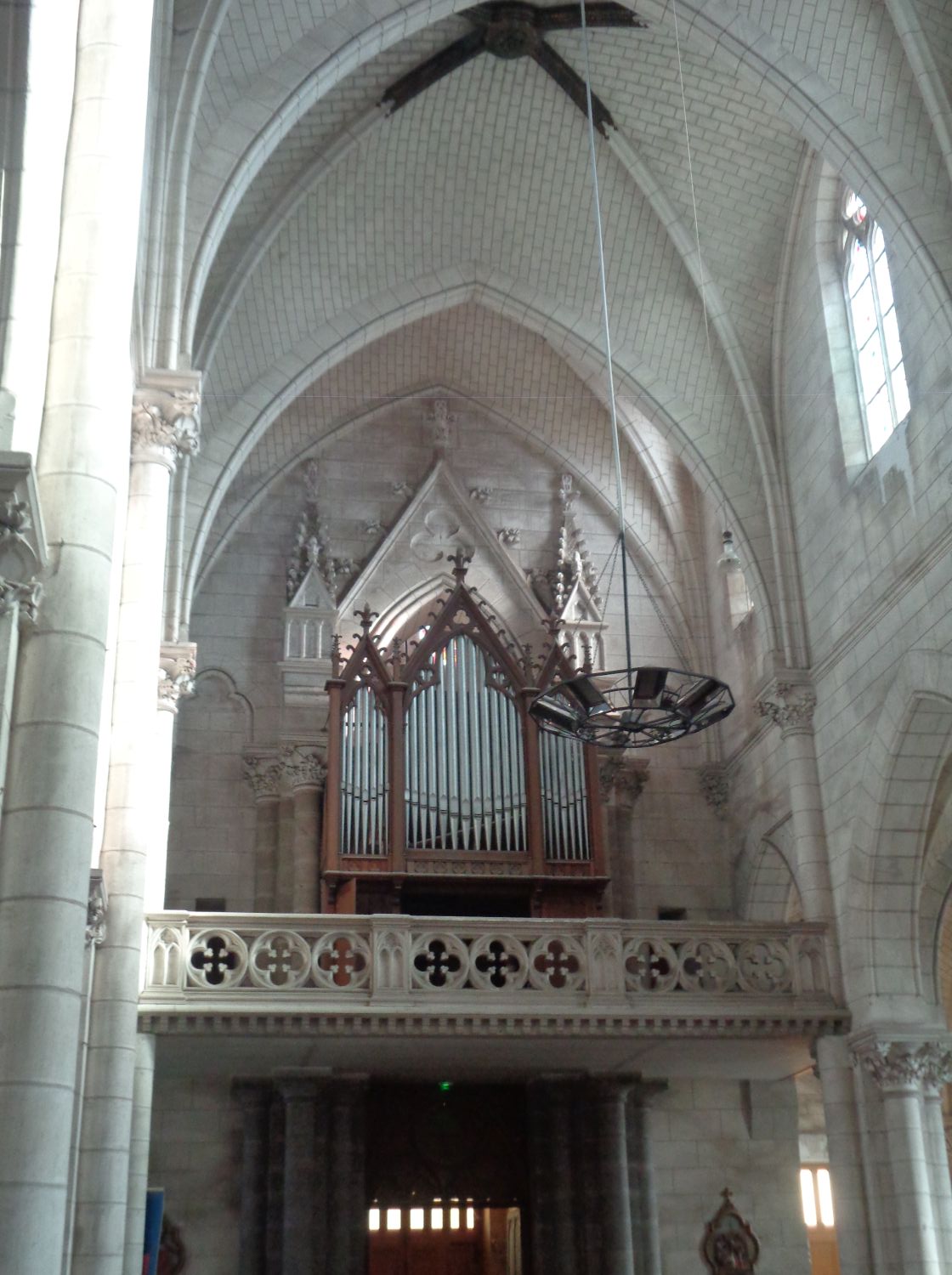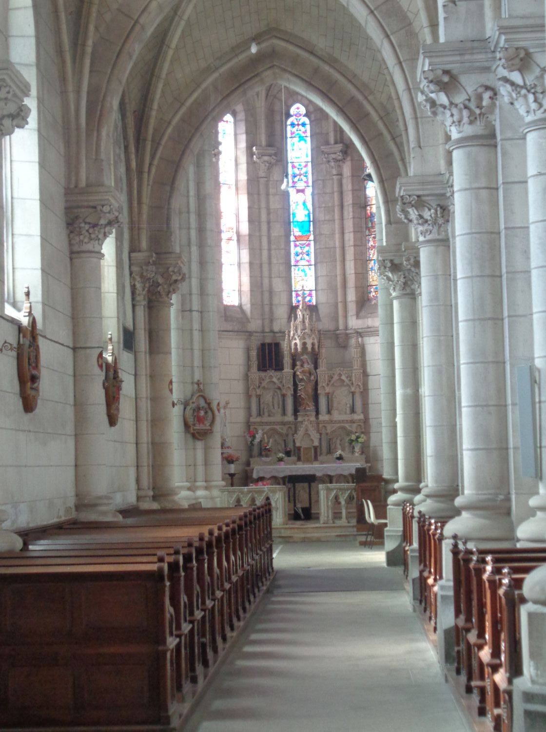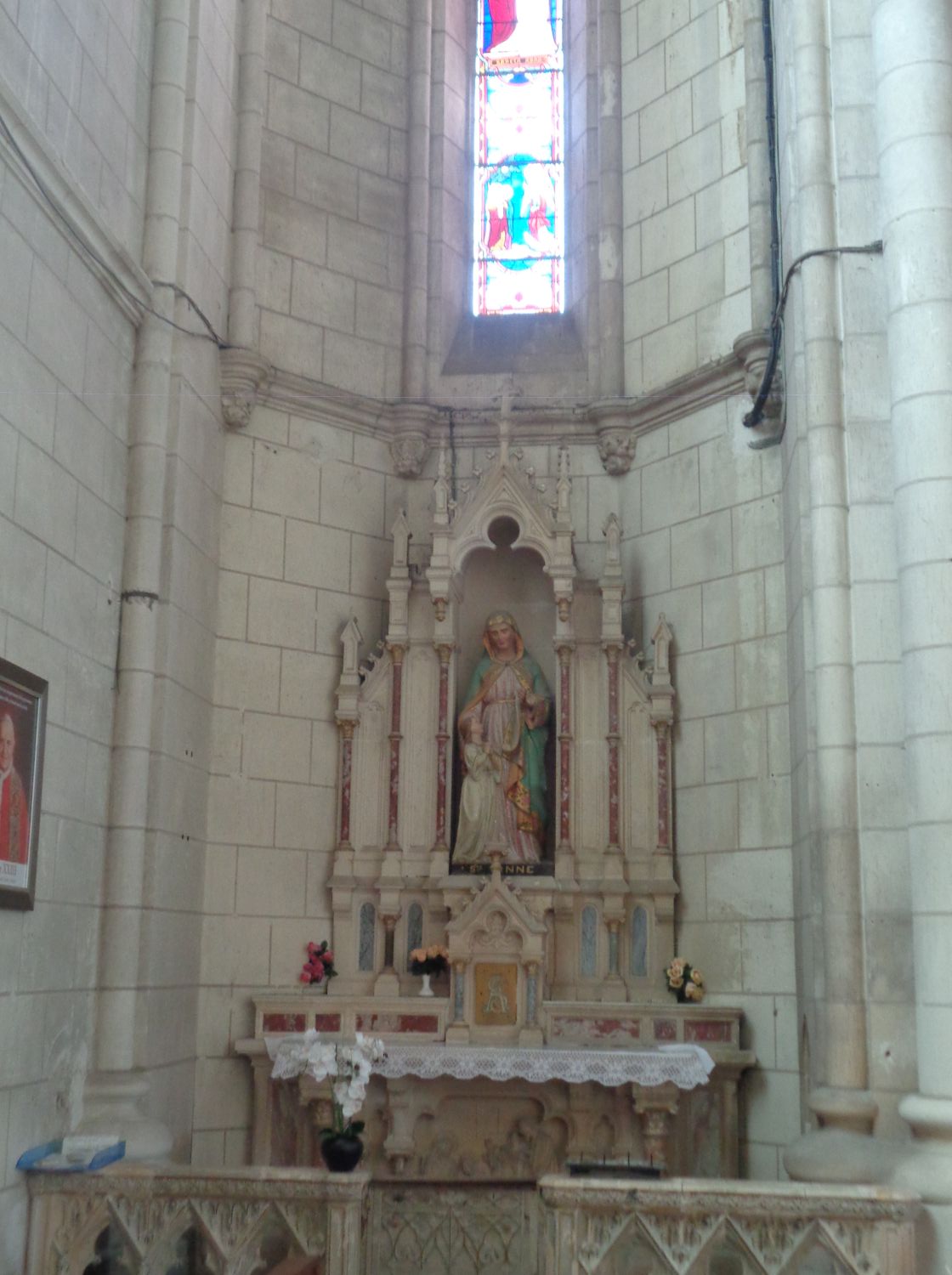 The Church of Saint Pierre on its statues : On the right: Anne and Mary as a child, the Virgin and Child, the Sacred Heart, Joseph and the Child. On the walls: in the left arm of the transept, Our Lady of Lourdes (1954); in the right arm, Thérèse of the Child Jesus , Joan of Arc, beatified in 1909. At the two entrances to the church, two statues that have just been restored: Hilary (1925 model) and Peter. Near the entrance, in the side aisles, two confessionals have been preserved. The Stations of the Cross are made of polychrome bas-reliefs. A large crucifix is located at the end of the nave, on the right, at the entrance to the crossing of the transept, probably opposite the location of the pulpit Three bells were baptized in 1896 (Louise Emilienne-Alfred, Jeanne-Marie-Augustine, Henriette Joséphine-Madeleine). Another was blessed by Bishop Vion in June 1950 (Paule-Thérèse). The organs were blessed by the bishop in 1939. They were rebuilt in 1959. In 1978, an electronic organ was purchased. And in 2014, a new batistery, made of repoussé metal, was blessed.