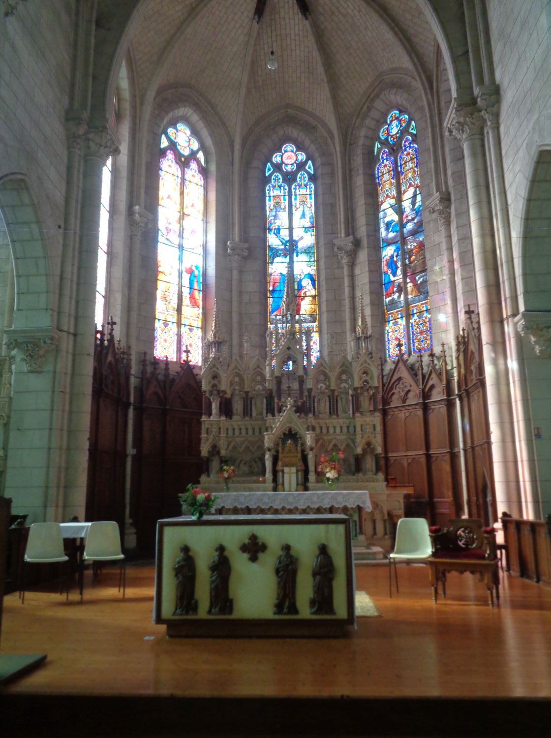 The square bell tower has two floors, one solid with arcades, the other with bays, but the originally planned spire was never built. The bell tower roof was redone in 2002. The central nave is reinforced on the outside with flying buttresses. The central nave, lit by tall windows, is flanked by lower side naves also with windows. The naves are approximately 40 meters long and 20 meters wide. At the front, the Last Supper, between an unidentified saint accompanied by a bird and John the Baptist. The tabernacle, whose door is decorated with the Lamb (Christ), is surrounded by a Nativity and a Deposition from the Cross, and on the wings by Saints Peter and Paul. Above, a metal cross between two angels is flanked by three saints on each side: Our Lady of the Seven Sorrows, Saint Henry, a bishop, a pope, Saint Expeditus, Saint Radegonde. At the very top, more angels. The altars of the transept are preceded by a stone communion table. On the left, on the front of the first altar, Mary appears between her parents Anne and Joachim. On the front of the second altar, we have the Death of Mary; above the and on the wings by Saints Peter and Paul. Above, a metal cross between two angels is flanked by three saints on each side: Our Lady of the Seven Sorrows, Saint Henry, a bishop, a pope, Saint Expeditus, and Saint Radegonde. At the very top, more angels. The altars in the transept are preceded by a stone communion table. On the left, on the front of the first altar, Mary appears between her parents Anne and Joachim. On the front of the second altar, we have the Death of Mary; above it, the Apparitions of Mary at Lourdes and La Salette. In the right arm of the transept, on the front of the first altar, Jesus shows his Heart to the apostles, between an angel holding a chalice and an angel holding a cross. The tabernacle with a Heart is flanked by the Apparition of Jesus to Marguerite-Marie Alacoque, and Jesus and the Samaritan Woman. On the upper floor, a Sacred Heart is placed between angels carrying the instruments of the Passion. On the front of the last altar: the Holy Family. Following the Second Vatican Council (1962-1965), to allow celebrations facing the people, which was already practiced during the first Christian millennium, a wooden altar was installed in 1967 at the entrance to the choir. Statuettes of the four evangelists with their symbols decorate the front. Jesus is depicted in front of the ambo. This is probably the reuse of panels from the pulpit. The communion table of this facade, with a porch bell tower, punctuated by four pinnacles, has three doors whose tympanums were decorated in 1966 with beautiful ceramic compositions, donated by an anonymous parishioner, They represent: Mary and the Child Jesus. the resurrected Jesus, with on the right, in the night, the destruction of Cerizay by the nazis on August 25, 1944, the Baptism of Jesus by John the Baptist. On the gables above the tympanums are the statues of Jesus, with, on the book, an alpha and an omega, the first and last letters of the Greek alphabet: “I am the Alpha and the Omega, the Beginning and the End”, between the apostles Peter on the left, and Paul on the right with the sword of his martyrdom. The square bell tower has two floors, one solid with arcades, the other with bays, but the originally planned spire was never built. The bell tower roof was redone in 2002.
