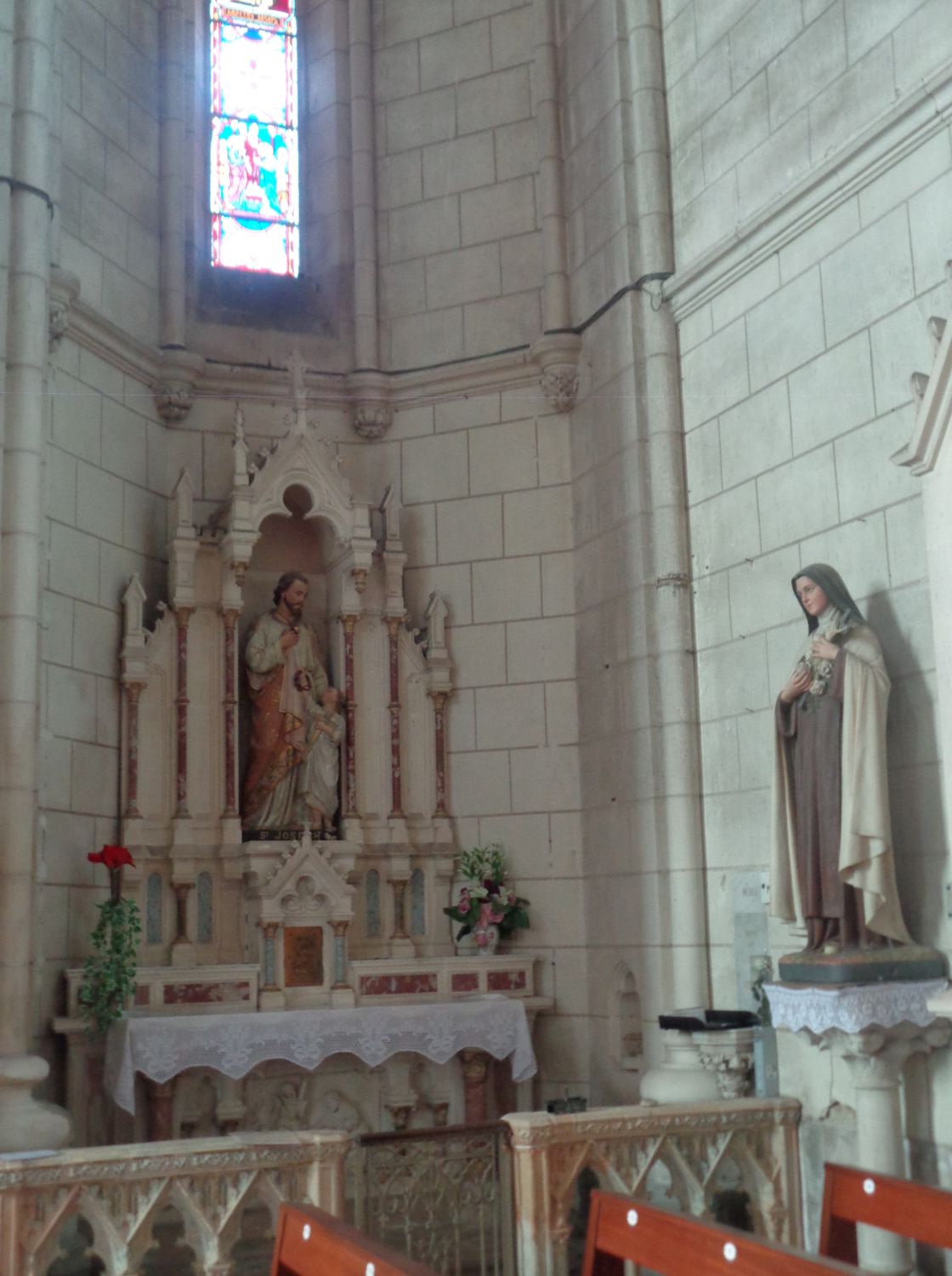 The Church of Saint Pierre on its statues : On the right: Anne and Mary as a child, the Virgin and Child, the Sacred Heart, Joseph and the Child. On the walls: in the left arm of the transept, Our Lady of Lourdes (1954); in the right arm, Thérèse of the Child Jesus , Joan of Arc, beatified in 1909. At the two entrances to the church, two statues that have just been restored: Hilary (1925 model) and Peter. Near the entrance, in the side aisles, two confessionals have been preserved. The Stations of the Cross are made of polychrome bas-reliefs. A large crucifix is located at the end of the nave, on the right, at the entrance to the crossing of the transept, probably opposite the location of the pulpit Three bells were baptized in 1896 (Louise Emilienne-Alfred, Jeanne-Marie-Augustine, Henriette Joséphine-Madeleine). Another was blessed by Bishop Vion in June 1950 (Paule-Thérèse). The organs were blessed by the bishop in 1939. They were rebuilt in 1959. In 1978, an electronic organ was purchased. And in 2014, a new batistery, made of repoussé metal, was blessed.