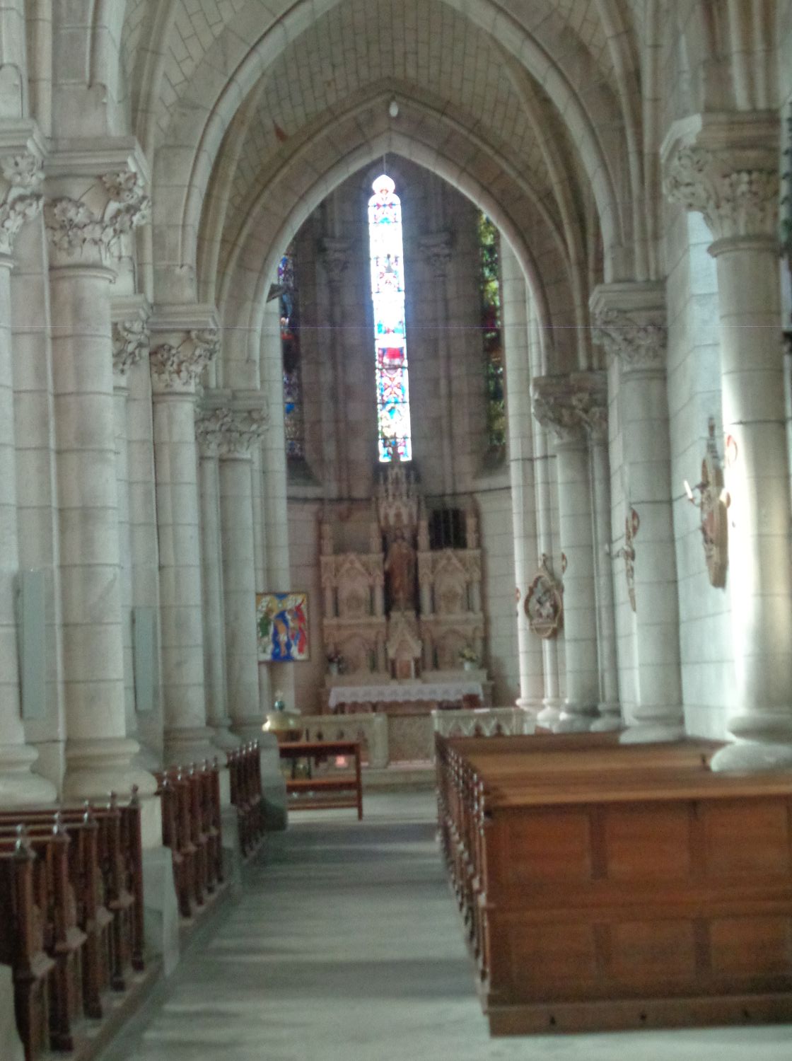 The Church of Saint Pierre on its stained glass windows ! On the left ,1st apse stained glass window offered by Christian mothers, from bottom to top, Nativity of Mary, Anne teaches Mary to read, Presentation of Mary at the temple. 2nd apse: stained glass window on the left, from top to bottom, Visitation, Apparition of Mary at Lourdes, Annunciation; stained glass window on the axis, Flight into Egypt, Mary seated with the Child, Presentation of Jesus at the temple; stained glass window on the right, the Holy Family, Apparition of Mary at La Salette, Jesus among the doctors. On the right. 1st apse: stained glass window on the left, from bottom to top, Jesus crowned with thorns, Jesus in the Garden of Olives, Jesus carrying his cross meets his mother; stained glass window on the axis, Adoration of the Shepherds, Last Supper (Jesus shows his Heart to John), Crucifixion; Right stained-glass window, Jesus falls under the weight of the cross and Veronica wipes his face, Christ appears to Marguerite-Marie Alacoque, Entombment. 2nd apse, from bottom to top: Marriage of Joseph, Joseph and the Child Jesus, Death of Joseph. Most of the stained-glass windows, executed between 1890 and 1892.