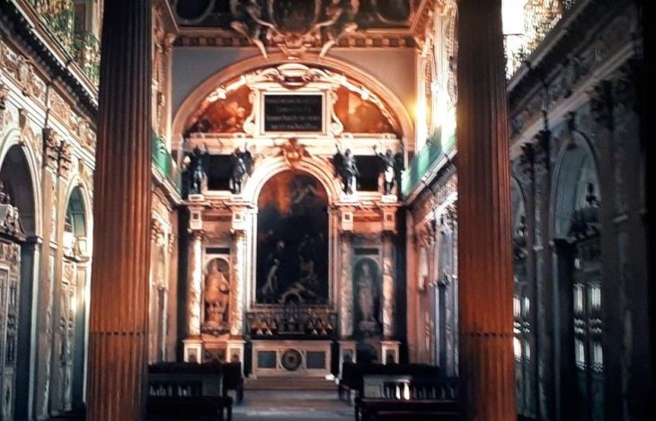 For info, above ceiling is showing the Christ of the judgment surrounded by the first seven intelligences and justice. This was the ancient church convent of Trinitarian clerics settled here by Saint Louis in 1259, this one was attached to the castle under king François Ier. Rebuilt from this reign and under Henry II, the Chapel received the present vault under Henri IV and was finished by Louis XIII and then enriched by Louis XIV, Louis XV and Louis XVI. This chapel is a masterpiece of classicism! The Chapelle de la Trinité or Trinity Chapel is rectangular in shape. It is placed in the east wing of the Cour d’honneur ,to the left of the Great horseshoe staircase. The roof is double-sloped. The Interior is on two levels, the Chapel hosts the Royal Tribune in the background above the entrance. It is illuminated by high rectangular windows placed on the second level, alternating with oval cartridges decorated with paints. The first level is composed of side chapels closed by ornate wooden grates alternating with the batteries decorated with double Corinthian pilasters.On the north side, the monumental altar is composed of a triumphant arch altarpiece decorated with bronze incense bearer statues of angels and adorned in its center a painting depicting the deposition of the Cross. Behind this altarpiece was located the choir of religious Trinitarian. The arched vaulted ceiling is richly decorated with paintings framed in cartridges, frames and floral decorations in stucco. The balconies were destined for the king’s music.