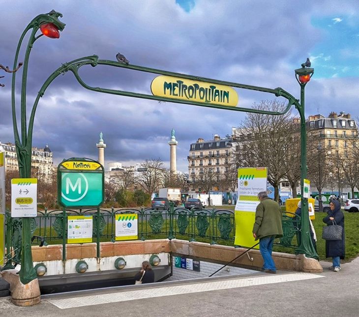 Metro station Nation is a station on lines 1, 2, 6 and 9 of the Paris Métro, located on the border of the 11éme and 12éme arrondissements of Paris. The station is located under and around the Place de la Nation. It takes its name from the Place de la Nation, so named since 1880 in honor of the National Day of France. The station on line 1 is curved, under the southern part of the square. The terminus of line 2 forms a loop under the square. The arrival on the loop is under Avenue de Taillebourg, and the departure under Avenue du Trône, Place des Antilles and Boulevard de Charonne. The terminus of line 6 also forms a loop, with the arrival under Avenue du Bel-Air and the departure under Avenue Dorian, Rue de Picpus and Avenue de Saint-Mandé. The station on line 9, also curved, is located lower than the others, under the northern part of the square, between Boulevard Voltaire and Avenue de Taillebourg. It is the only metro station that has two lines as a terminus. This station has six accesses or entrances, some of which are shared with the RER. Access no. 1 “Avenue du Trône” is located opposite no. 28 Place de la Nation, at the corner of Avenue du Trône and Avenue du Bel-Air. It has a fixed staircase. Access no. 2 “Avenue Dorian” is located opposite no. 6 Place de la Nation, at the corner of Rue Jaucourt and Avenue Dorian. Consisting of a fixed staircase, it is decorated with a Guimard aedicule. Access no. 3 “Boulevard Diderot” opens in front of no. 4 Place de la Nation, at the corner of Boulevard Diderot and Avenue Dorian. With a fixed staircase, it is also decorated with a Guimard-style aedicule. Access no. 4 “Boulevard Voltaire” is located at the right of nos. 1 and 3 Place de la Nation, at the corner of Rue du Faubourg-Saint-Antoine and Boulevard Voltaire. It has escalators reserved for the exit as well as two fixed staircases. It provides direct access to the RER. Access no. 5 “Avenue de Taillebourg” is located opposite no. 15 Place de la Nation, at the corner of Avenue de Taillebourg and Avenue du Trône. It has escalators and fixed escalators and provides direct access to the RER. Access no. 6 “Avenue du Bel-Air” opens in front of no. 24 bis Place de la Nation, at the corner of Avenue du Bel-Air and Rue Fabre-d’Églantine. It consists of an elevator that only provides access to the RER. The station opened on July 19, 1900 during the inauguration of the first section of line 1 between Porte de Vincennes and Porte Maillot. The platforms of line “2 Nord” (now line 2) opened on April 2, 1903, line 6 on March 1, 1909. Finally, line 9 opened on December 10, 1933.