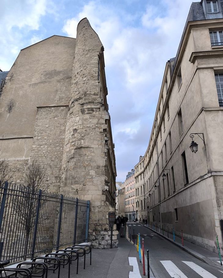 The Rue des Jardins-Saint-Paul is a street located in the 4éme arrondissement of Paris,now call Paris Centre ,and in the Saint-Gervais neighborhood or quartier. The nearest metro stations are Saint-Paul (line 1), Pont Marie (line 7) and Sully – Morland (line 7). It is so named because the oldest part of this street was opened in the 13C on gardens near the Paris enclosure wall. The part between Rue des Barrés and Rue Charlemagne is the oldest part; it is mentioned in sales contracts from 1277 and 1298. This section was called “Rue des Jardins” because the space in front of the fortifications was unbuildable. Notable buildings here tell us that it has the distinction of running along the longest portion of Philippe Auguste’s wall enclosure still in existence. The street runs along a playground that separates it from the remains of the ancient wall of Paris built between 1190 and 1220 during the reign of Philippe Auguste. This section, 60 metres long and 8 metres high, visible only from the side This wall still has two visible towers, one in the middle of the sports field and the other at the intersection with Rue Charlemagne (236 metres long , and named after Charlemagne, King of the Franks and Emperor, who created the Carolingian dynasty) The latter tower is called the Tour Montgomery , named after the captain of Henry II’s Scottish guard and involuntary regicide of the same king in 1559, who was supposedly imprisoned there after the fatal joust. This tower, now reduced to a quarter, defended the porte Saint-Paul gate of the enclosure wall, Notable buildings here are at No. 8: house in which François Rabelais died on 14 March 1553, Nos. 9 and 15: remains of the Philippe Auguste enclosure wall, Nos. 13 and 14: the Lycée Charlemagne high school (the ceilings of the main staircase and the library are decorated with murals as well as certain parts of the building), and No. 18: hotel of the president of Châteaugiron, built under Louis XIV. Old street inscriptions on the corner.
