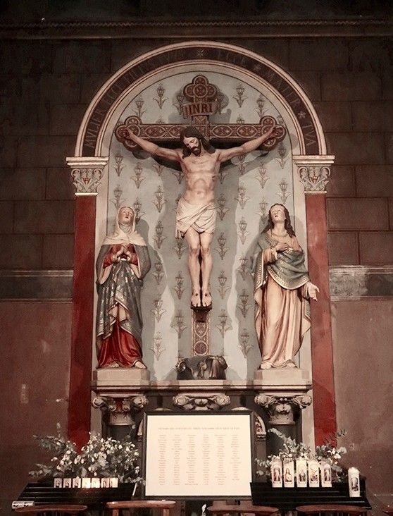 The Church Saint-Ambroise is located in the quartier Saint-Ambroise , the 42nd neighborhood in the 11éme arrondissement or district of Paris. It gave its name to the Saint-Ambroise neighborhood. The site is served by the Saint-Ambroise metro station of line 9, The Church Saint-Ambroise was built in a hybrid and eclectic style, sometimes called the “Second Empire style”, which combines neo-Romanesque with some elements of neo-Gothic. The church is 87 meters long and 37 meters wide at the transept, has two identical bell towers 68 meters high, ending in an iron cross surmounted by a weather vane in the shape of a rooster. The porch has three entrance doors each with a neo-Byzantine style enameled lava painting on its tympanum. Below the wonderful Chapelle du Souvenir or Chapelle du Calvaire (Chapel of Remembrance or Chapel of Calvary).
