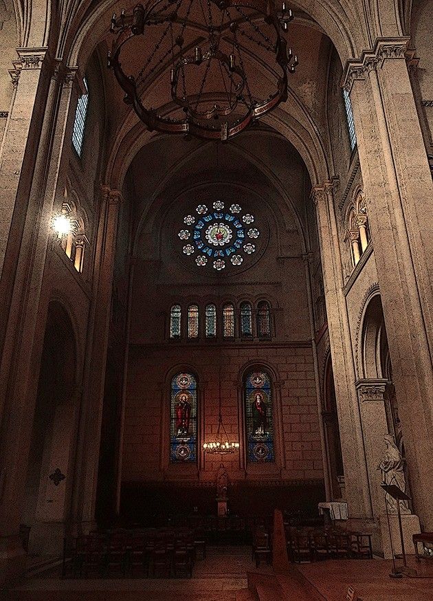 The 20 meters high nave includes a triforium opened by a series of triplets of bays with semi-circular arcades. The vaults are mounted on semi-circular ribbed vaults. These vaults are typical of Norman Romanesque art. The church’s furnishings and works of art includes the L’Espérance and La Foi, stone statues of 1829, works that have disappeared; L’Immaculée Conception presented at the Salon of 1824. The baptismal font is made of white marble. It is supported by eight red marble columns. The cover was surmounted by a cross with the Mystic Lamb, which has disappeared. In the left transept is the Chapel of Saint Augustine, with two wall paintings: on the altar side Saint Augustine reconciling the Catholics and the Donatists at the Council of Carthage, opposite Saint Augustine putting an end to the barbaric custom of fighting between relatives to practice war. In the right transept is the Chapel of Saint Ambrose, on the altar side Saint Ambrose forbidding the Emperor Theodosius from entering the church of Milan, opposite Saint Ambrose delivering the sacred vessels of his church to ransom prisoners. All painted by Jules Lenepveu The stained glass windows were made in 1868 , The great gallery organ was built in 1869. There is also a choir organ, located behind the altar, The three bells are located in the right tower, under a wooden frame ; baptized under the names of Saint Eugenie, Saint Mary and Saint Catherine. Below the Chapelle Saint-Ambroise.