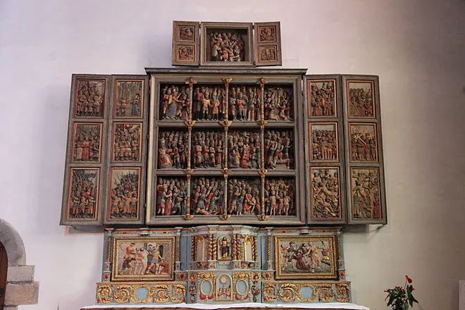 The famous Altarpiece of the Martyrs, this one is a polychrome carved piece dedicated to the remembrance of the ten thousand martyrs of Mount Ararat, Legionnaires executed for their faith under the reign of the Roman emperor Hadrian. Under the altarpiece, probably the former high altar of the Church Saint Pierre (St Peter’s) until 1754, with a Tabernacle and two bas-reliefs. These very different formats than the altarpiece represent the flogging and fall of Jesus when he wears the Cross. The Christians of this Legion were allegedly massacred for refusing to sacrifice to the gods. If a date is engraved at the top left as 1624, it would be in fact only a restoration or reorganization of the panels. Considering the importance of devotion and style, the work dates from the early 16C.