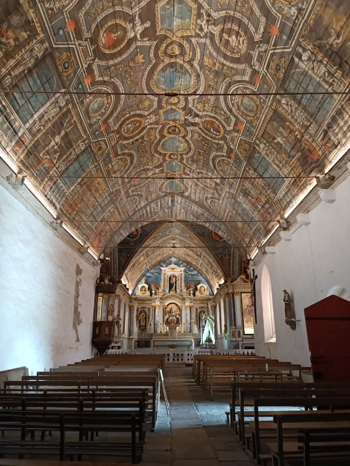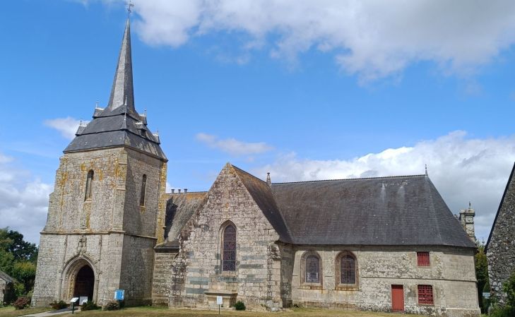 The Chapelle Notre-Dame de Carmès is typically polylithic and has the oldest and most important wall paintings recounting the main episodes in the life of Christ and the Virgin, on the panel showing the Coronation of Christ. The western porch and the nave date from the end of the 15C to the beginning of the 16C. The braces and the choir were completely redone in 1768. The upper parts of the bell tower were redone in the 18C. A large square granite tower, surmounted by a slate covered spire, houses a large entrance porch on the south side. This porch is covered with a paneling and its walls are painted with portraits of the apostles. A turret, polygonal part, cylindrical part, encloses the access staircase. From the 15C, the transept, the nave and the beginning of the choir remain. The bell tower-porch is also from this period, it bears the date 1521.