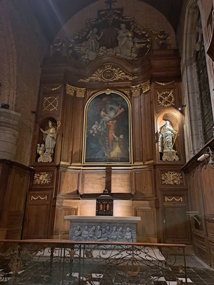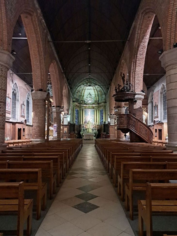 The southern chapel known as crossbowmen is dedicated to Saint Sébastien. Erected from 1551, it is built in a flamboyant Gothic style. The North Chapel, dedicated to Sainte Anne, is offered by the rhetorical society. The brick and sandstone tower, which was under construction in 1515, measures 39.50 meters. The white stone arrow, destroyed in 1940 and then rebuilt identically in 1994, is almost 32 meters away, which made a total of about 77 meters.