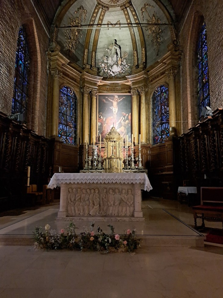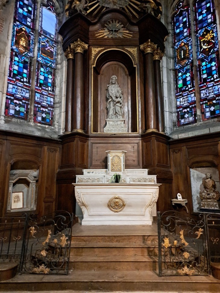 The altarpieces : Choir. False white marble, saint away carried by the angels. Tabernacle rotating in gilded wood. Angels worshipers. In front of altar in gold sheet. Painting: Crucifixion , North altar, altarpiece, statues: Saint Catherine, Saint Dominique, Tabernacle,Portrait Put in the tomb,, late 18C-early 19C, North chapel dedicated to Saint Anne: altar, altarpiece, statue: Saint Anne and the Virgin, 18C, South nave: altar, altarpiece, portrait: descent of the cross, statues, tabernacle, 18C, South chapel called crossbowmen: altar, altarpiece, 18C.
