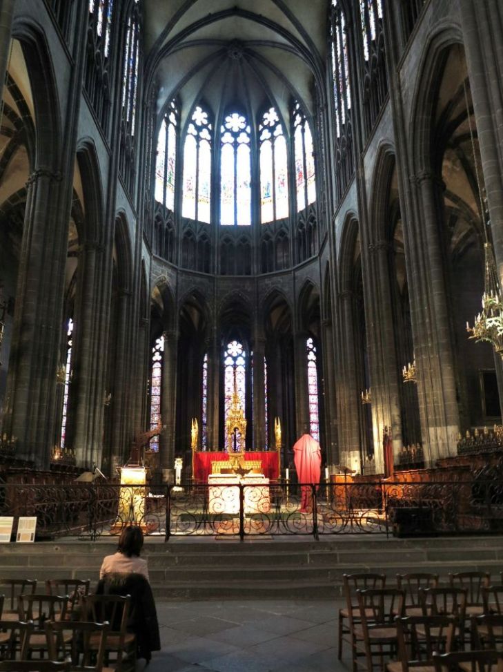 A bit of history I like tell us that in the 5C, Namatius, bishop of the City of Arvernes, built a first cathedral, thus obtaining that the Christian worship sort of the district called by Grégoire de Tours the “Vicus Christianorum” (current Saint-Alyre district) in its Historia Francorum of the 6C. The primitive cathedral was destroyed in 760 by Pépin le Bref, and restored by Bishop Adebert between 764 and 768. Again destroyed during the Norman raids in 915, it is bishop Étienne II, former abbot of Conques and brother of the Viscount of Clermont, who undertook to rebuild it in Romanesque style. It is in the 10C in Clermont that appeared the very first statue of a virgin in majesty. Around 946, Étienne II, former bishop of Conques, commanded a reliquary statue for the Virgin, perhaps inspired by the statue-reliquary of Sainte Foy with fine gold, undoubtedly manufactured in the 9C. Destroyed and melted for the treasury of Paris during the French revolution, In 1248, Bishop Hugues de la Tour decided to launch the site of a new cathedral, inspired by the Sainte-Chapelle, which had made its wonder during a visit to Paris. Build a church in the prestigious Gothic style from 1248 to 1287 on the choir, in which Saint Louis came to marry his son, the future Philippe Le Hardi, with Isabelle d’Aragon. The crypt discovered in 1885 is particularly mutilated with destroyed vaults, excavations to install sarcophagi and the foundations of the Gothic cathedral. We can restore its original plan around the year 1000, During the French revolution, the revolutionaries wanted to bring down the Church, and many destruction took place in 1790 and 1793, but the Benedictine Dom Michel François Verdier de Latour succeeded in persuading them that it would constitute an excellent popular gathering place. Only roods, stalls, altar, statues and furniture, with the exception of the Pascal candlestick were destroyed and three of the towers of the transepts were demolished, The Romanesque facade of the cathedral of Etienne II was done in 1851. In 1862, Napoleon III delivers, on the occasion of his stay in the city, the credits necessary for completion work, made from 1866 in 1884, the western facade with its arrows and the last span of the nave were finally completed in full compliance with methods construction of the Middle Ages. The access emmerge on rue des Gras was only carried out at the very beginning of the 20C. During this work, the birthplace of Blaise Pascal was destroyed.
