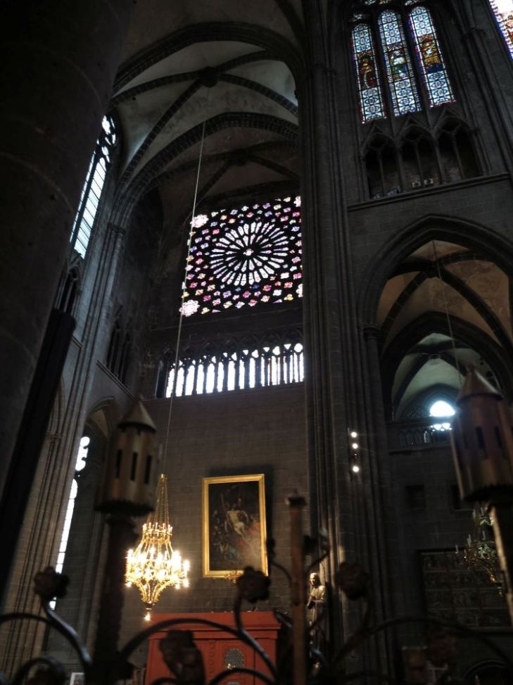 The center of the crypt is organized from three confessions overlooking a square room made up of three naves covered with edges based on columns, The choir, the transept and the start of the nave are completed around 1273. From 1325 to 1340, the towers of the transept arms were raised by an unknown artisan. The nave seems to be completed in the 1340s, based on the facade of the Romanesque building, which was ultimately destroyed in the 19C, The Tour Bayette tower, which flanks the east side of the north portal, owes its name to the lookout formerly posted at its summit. It is surmounted by a turret, itself adorned with a wrought iron campanile with a southern look. This is the only tower remaining of the four similar towers. The predominantly blue rose placed above the north portal dates from the 14C as well as that with orange tone which overlooks the southern portal. Both are an 8.50 -meter square. Dating from 1350, the southern facade once overlooked the buildings of the bishopric.
