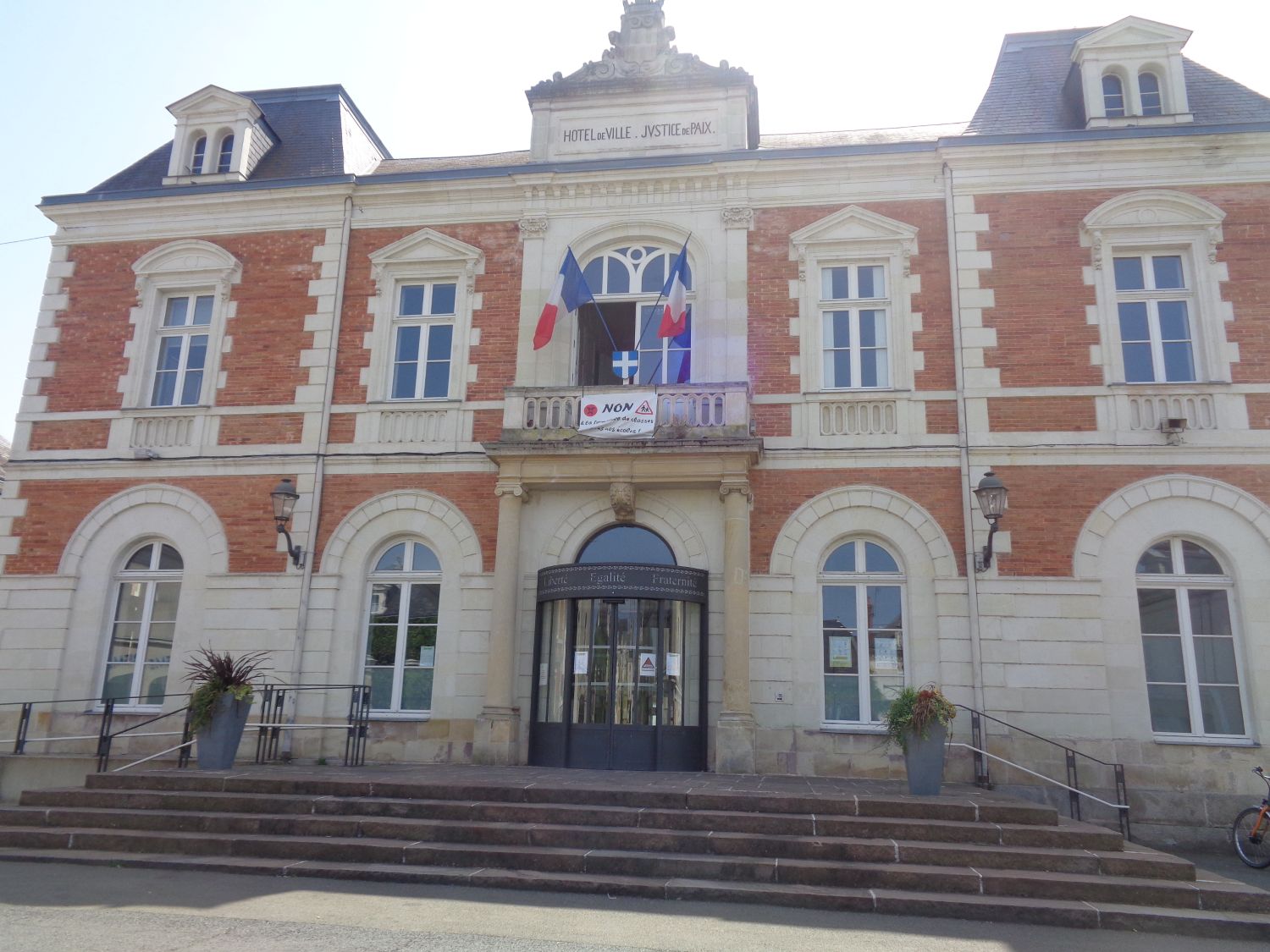 The new Hôtel de Ville or City/town hall building has been the grain market, justice of the peace and City hall of Le Lude built with a compact, solid plan, flanked by pavilions. It was designed to emphasize the municipal presence in the town . Standing alone, it has four facades. The largest is to the north and led to the later creation of a place de l’Hôtel de Ville or city hall square, to give the building some perspective. The City/town hall and market hall functions are back-to-back. The ordered brick and stone facades are in the neo-Louis XIII style. The eastern bank of the building was regularized by a curtain of facades reminiscent of this style. The bell tower, present on many 19C public buildings, was removed. The first known auditorium was installed above the old market hall. In 1703, it moved to the site of the Captain of the Hunt’s lodgings near the Church Saint-Vincent. It then consisted of a tall building containing a courtroom and a council chamber, then a tower containing a laundry room and a cellar, and finally a low building to house a guard. In August 1763, the old market halls were demolished , In November 1763, the farmers of the Vaunaval, Aubevoies, Sablonnets, and Petit Malidor farms hauled sand and stone for the new market halls in town. These halls were later deemed poorly constructed because they were on either side of the street. It was then recommended that they be combined and the Rue des Halles covered. In 1846, the City/town hall was located on the site of the former Sainte-Anne hospital, on the Grand-Rue, then renamed rue de la mairie. In 1856, faced with the dilapidated state of the old premises, the town of Le Lude decided to build a new city hall. The preferred location was the former Place du Marché aux blés, in the commercial center of the town. The new building would combine three functions: City/ town hall, grain exchange, and justice of the peace or court. This project required the destruction of a first block located between rue du Château, rue de Guigne-Folle, and place du Marché-aux-blés. Work began the same year with the widening of the streets adjoining the square. The new Hôtel de Ville was built between 1857 and 1863.