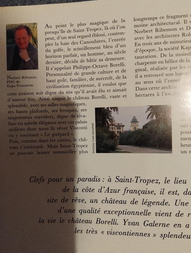 This was the last project my dear late wife Martine worked in her Paris office with the former Kapa Promotion, they renovated luxurious properties all over France, I did met her boss who is in one of the pictures I took from the brochure, The property was the Château Borelli in the heart of the Parcs de Saint Tropez, This impressive building consists of two majestic towers and a large central section, all covered in extravagant ornamental details. Today, it houses six ultra-luxurious private apartments. A 150 m² apartment in this historic gem would cost no less than 10.5 million euros. Château Borelli is also a historic jewel of Saint-Tropez and holds a fascinating history within its walls.