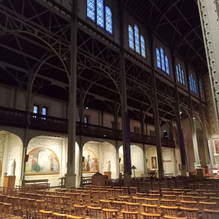 The Church Notre Dame du Travail has a remarkable thing here is the interior with an industrial architecture unique in Paris, Directly influence by Gustave Eiffel and Baltard, the metallic canopy of the nave comes as the wishes of abbe Soulange-Bodin who wanted a church to unite the workers and the faithful, The church house a bell weighting 552 kg offered by Napoléon III in 1865 that came from the city of Sebastopol and brought back to Paris during the war of Crimea. Hence this intertwining of trellises, typical of railway stations. An iron frame with a pale light. The stained glass windows, in Art Nouveau or Geometric style, have warm and cool shades to soften the brightness.