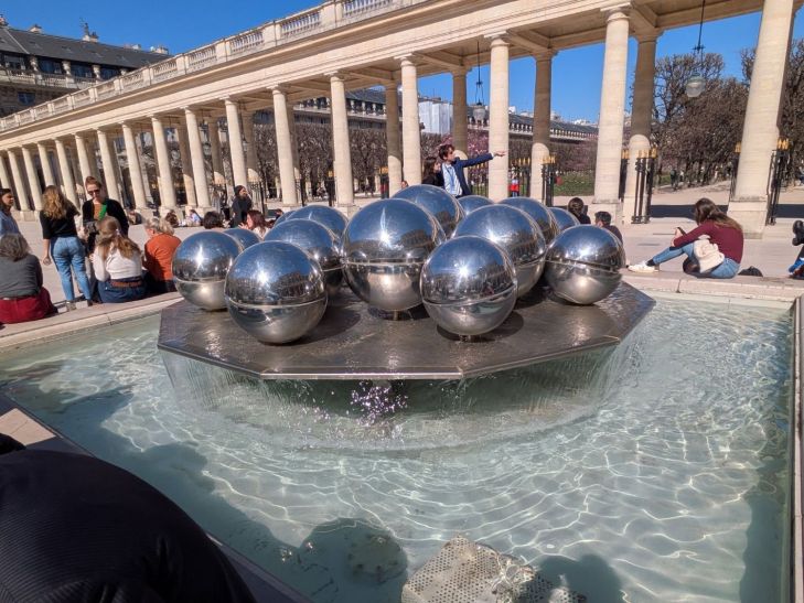 Pol Bury’s two horizontal fountains with slowly moving metal balls were installed in 1985 on the forecourt of the Cour d’Orléans, between the Constitutional Council and the Ministry of Culture in Paris, at roughly the same time as Daniel Buren’s columns. Pol Bury, a Belgian artist born in 1922 in Wallonia and deceased in October 2005, joined the Hainaut Surrealist group in 1939 and settled in France in 1961. He installed fountains at the University of Iowa (1969), the Maeght Foundation (1978), and the Seoul Olympic Games (1988), also designing gigantic works, such as magnetic drums on which 12,000 marbles drift (1971) or, as at the FIAC 1999 (Louis-Carré Gallery), a fountain composed of fourteen polished steel spheres. Pol Bury’s Spherades, kinetic fountains nestled in the heart of the Palais Royal, emit a fluid song, a murmur of the waves mixed with the clicking of metal and the creaking of the clockwork.