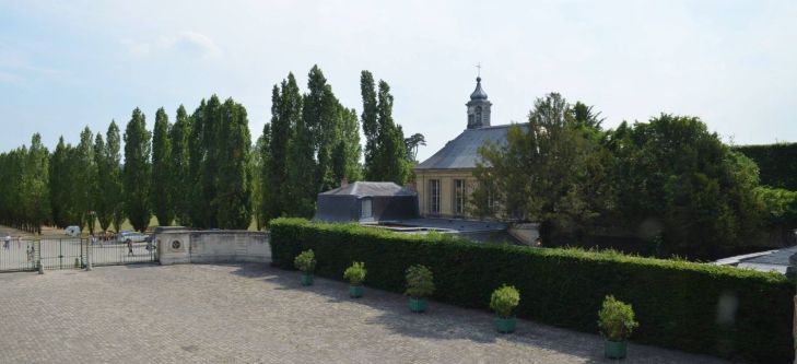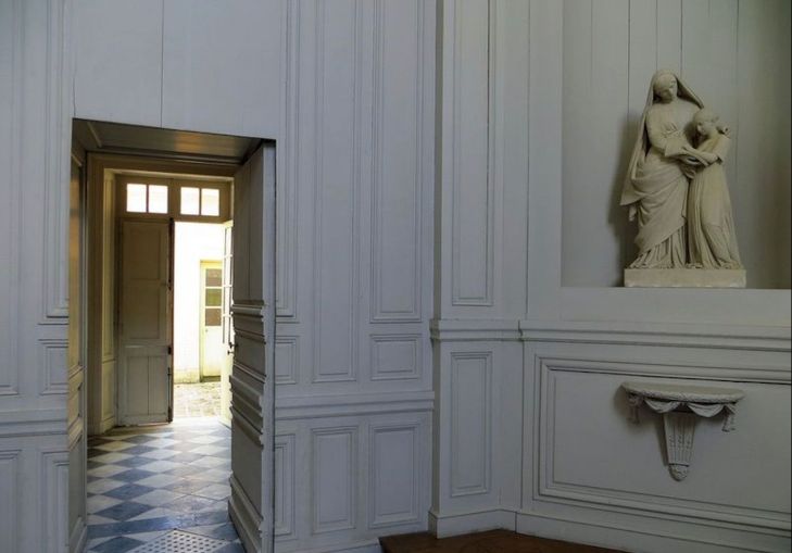 In 1772, Ange-Jacques Gabriel had a chapel built, topped with a bell tower. This would be the last addition during the reign of Louis XV, The Petit Trianon Chapel rises on two levels. Its decor is very sober; the room is lit by tall windows, two of which are painted in trompe-l’oeil, due to the presence of the adjoining outbuilding. The altar is framed by two columns and adorned with a radiant glory created by Joseph Prévôt. It is also surmounted by a painting by Joseph Marie Vien, painted specifically and installed in 1776. It depicts Saint Thibault of Marly offering Saint Louis and his wife, Margaret of Provence, an eleven-branched lily, symbolizing the posterity of his descendants. Facing the altar is a gallery, which can be accessed via the outbuildings staircase or directly from the French Garden.