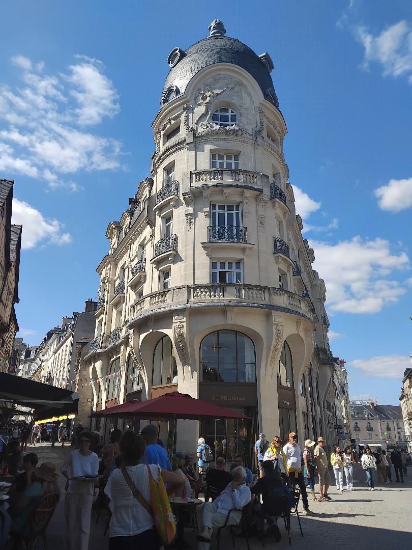 An imposing building built in street alignment on a large corner plot. With a double depth plan, the building shows an elevation on a mezzanine of 4 square floors under a circular dome and 2 square floors under a roof with long broken sides. The corner part is treated as a rotunda on high arcades and receives a neo-classical limestone decoration. For the construction of the dome, the building is made of reinforced concrete coated using the Hennebique process. Partial base in granite. Built for Mr. Chevreau, on plans drawn up on November 14, 1912 construction started in 1914, and was completed in 1923 “Au progrès” then “Saint-Rémy” and then Burton (see post), still today Au Progrés are the successive signs of the commercial stores installed on the ground floor and mezzanine of the building.