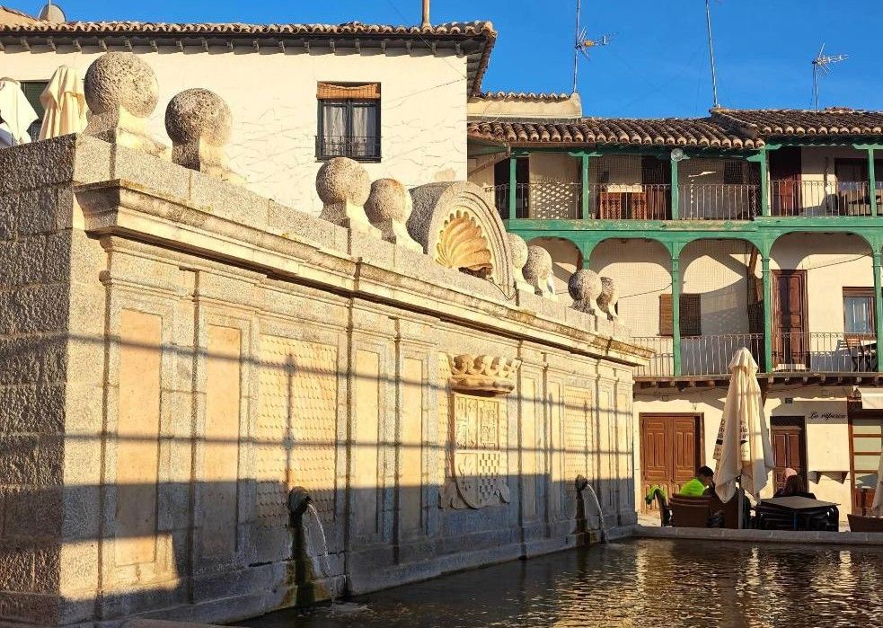 The Fuente Arriba or Upper Fountain is perfectly integrated into the Plaza Mayor, a splendid monumental ensemble developed over the 15-17C. The new fountain was designed in 1966, as part of the plaza’s redevelopment, and completed around 1970. This wall fountain,consists of a trough-style basin and a large rectangular front with two spouts. This front is divided into three large sections, delimited by paired pilasters, for a total of six. A continuous cornice runs along the entire top. The fountain is crowned with six stone spheres, one per pilaster, and a circular pediment in the center, which houses a scallop shell. This last piece serves as the crowning element of what can be considered the most valuable artistic feature of the entire fountain: the enormous coat of arms of Chinchón, located in the central section.