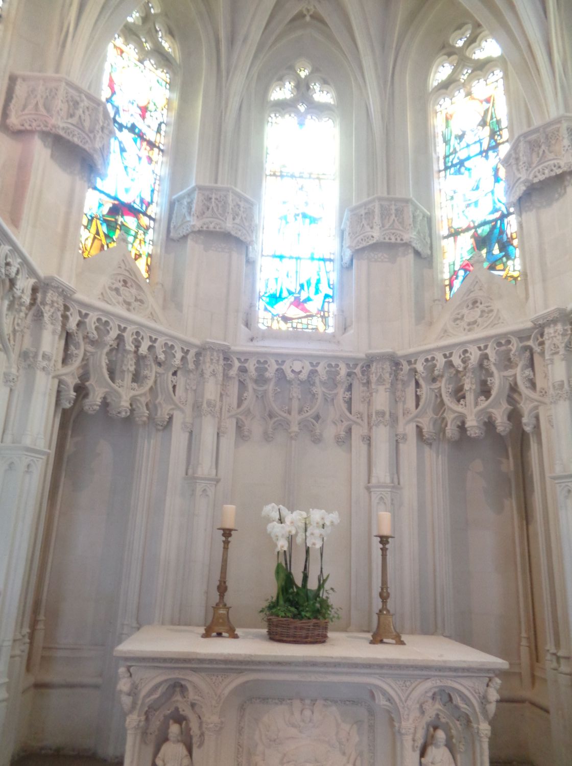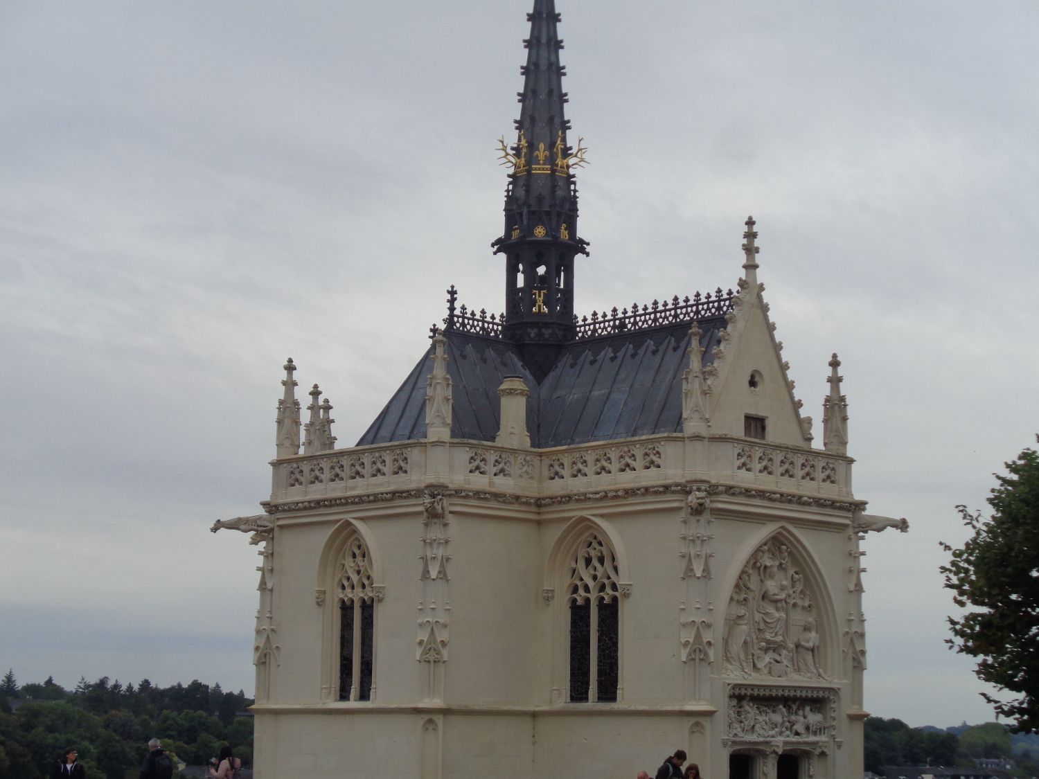 In the terraces you see the Chapelle Saint Hubert, dedicated to the patrons saint of hunters built under king Louis XI and finished by king Charles VIII, it is the resting place of the genius Leonardo da Vinci from May 2,1519. The Chapelle Saint-Hubert was built and sculpted between 1491 and 1496 by Flemish artists in The pure Gothic taste flamboyant in white tuffeau on the initiative of Anne de Bretagne and Charles VIII. The chapel then serves as an oratory in Anne of Brittany, before becoming the last presumed home of the body of Léonardo da Vinci, died in Amboise in 1519. The lintel of the front door represents the hunt of Saint Hubert. The stained glass windows, quite recent, retrace episodes of the life of Saint Louis, and the tympanum dating from the 19C, represents Charles VIII and Anne de Bretagne.