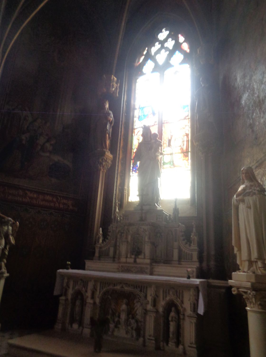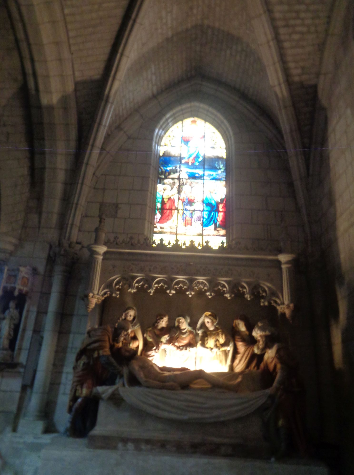The back wall of the southern aisle is occupied by a sculpture representing the Entombment, An exceptional atmosphere of contemplation surrounds the beautiful Entombment in the south aisle, built in the 16C. The magnificent polychrome stone Entombment comes from the Bondésir Chapel in Montlouis. It was commissioned by Superintendent Philibert Babou, Lord of La Bourdaisière, and is said to depict members of his family. Note the figures’ clothing and drapery. Joseph of Arimathea (holding Jesus’ head) and Nicomedes (at the feet) are richly dressed,