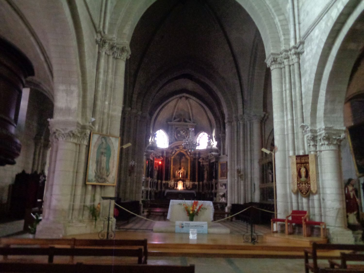 The splendid monumental altarpiece on the high altar of the Church Saint-Denis dates from the 17C. In the center is a painting of the Holy Family. Four statues adorn the altarpiece. From left to right: Saint James, Saint Denis (who, according to legend, holds his head in his hands after his beheading), an Archbishop of Tours, and Pope Urban VIII. In the upper section, two praying angels gather before a stone sculpture representing the Heavenly Father.