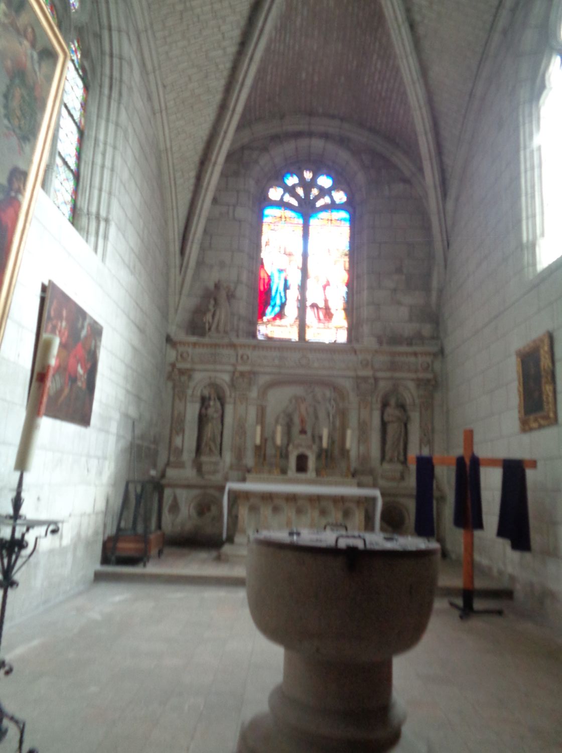 The back wall of the southern aisle is occupied by a sculpture representing the Entombment, An exceptional atmosphere of contemplation surrounds the beautiful Entombment in the south aisle, built in the 16C. The magnificent polychrome stone Entombment comes from the Bondésir Chapel in Montlouis. It was commissioned by Superintendent Philibert Babou, Lord of La Bourdaisière, and is said to depict members of his family. Note the figures’ clothing and drapery. Joseph of Arimathea (holding Jesus’ head) and Nicomedes (at the feet) are richly dressed,