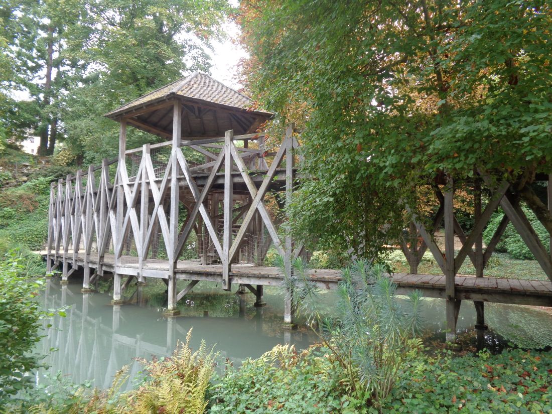 The Jardin de Léonard or Leonardo’s Garden was designed in the same way: all the answers to questions about the Master are there, accessible to children and adults alike. The trees, plants, and water movements found in codices and his paintings come to life in this garden dedicated to Nature. Stroll through Leonardo’s Garden, a veritable open-air laboratory where nature reveals its secrets. The paths lined with Italian cypress trees and Mona Lisa roses transport you to the master’s botanical universe. The rustling of leaves accompanies your discovery of the plants that fueled his imagination. At the bend in the path, a majestic 20-meter double-span bridge made of solid oak stands, a testament to the genius’s research into proportion and harmony. The walk continues to the country garden, where 26 species of plants and flowers recall those depicted in his most famous paintings. Rocks, caves, springs, belvederes, waterfalls, and mist effects evoke the sfumato technique. Here, the smallest details of his works are recreated. Around a pond bordered by century-old pines, Italian cypresses, and yews, you can admire the Madonna lily, the yellow flag flag, the horned violet, the black alders, the spreading cyclamen, and, of course, the famous Mona Lisa rose.