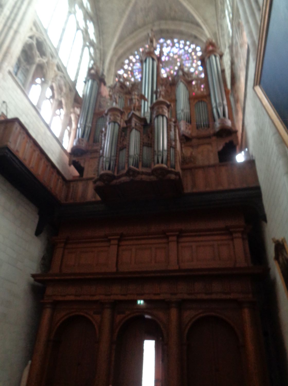 In 1468, Hélie de Bourdeilles, Archbishop of Tours, offered an organ to the cathedral. In 1543-1560: construction of another organ which was damaged in 1562 by the Protestants during the Wars of Religion and was placed on a wooden gallery at the end of the south arm of the transept. In 1927-1929: the organ was completely rebuilt. In 1990-1996: new reconstruction. Since 1979, the organ has been run by the Organo Pleno association. Since 1984, the organ case has been made of oak.