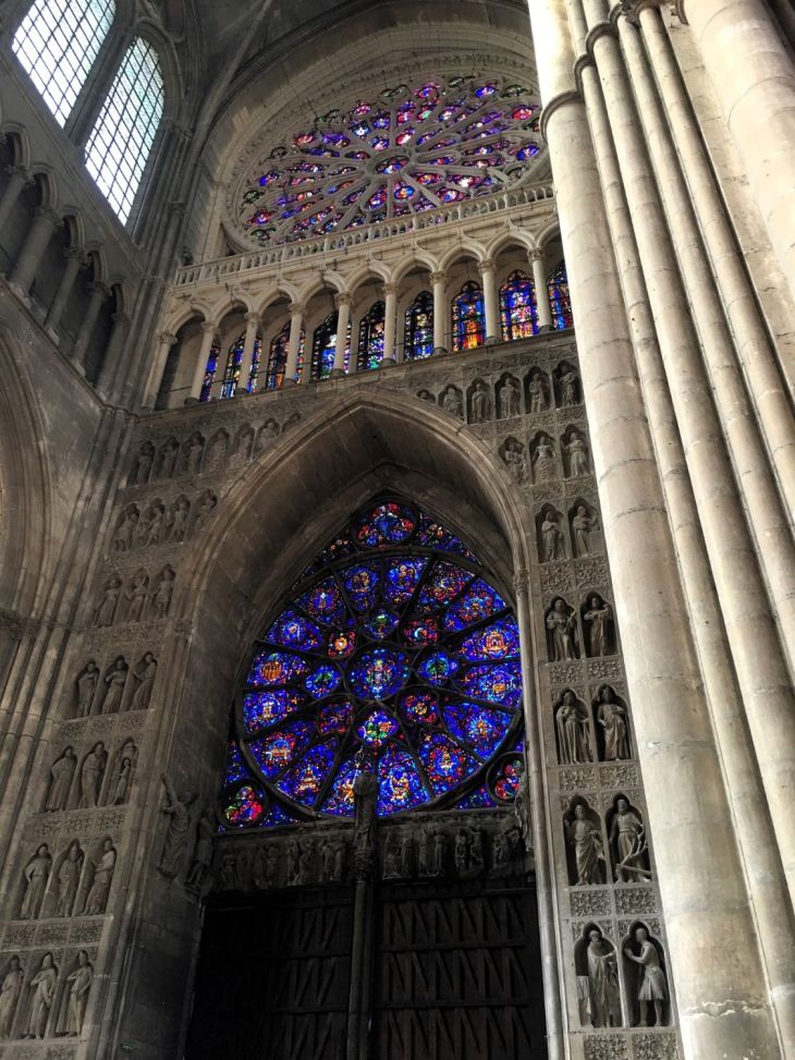 The large rose window with 12 meters in diameter surmounts the triforium, which cuts its arcading into stained-glass windows of the same shape. It shows the Resurrection of Christ, The 13C stained-glass windows were destroyed in a hurricane in 1580. They were completely blown out during the bombings of 1917 in WWI. The tracery of the rose window is identical to that of the rose window of the north transept. In the center, Christ draped in a red cloak reveals his wounds, surrounded by a row of angels carrying the instruments of the Passion, then by the apostles. The current stained-glass windows was created in 1937, largely respect the iconography established by the original. In the upper spandrel, Christ crowns the Virgin. To pay homage to the architects and master glaziers of the cathedral, the facial features of four of them are evoked in those of four apostles , The small Rose window shows the litanies of the Virgin installed in 1937, Mary and Christ are surrounded by 24 medallions representing the allegories of the litanies of the Virgin. At the top of the ogive: Mary Mediatrix refuge of sinners.