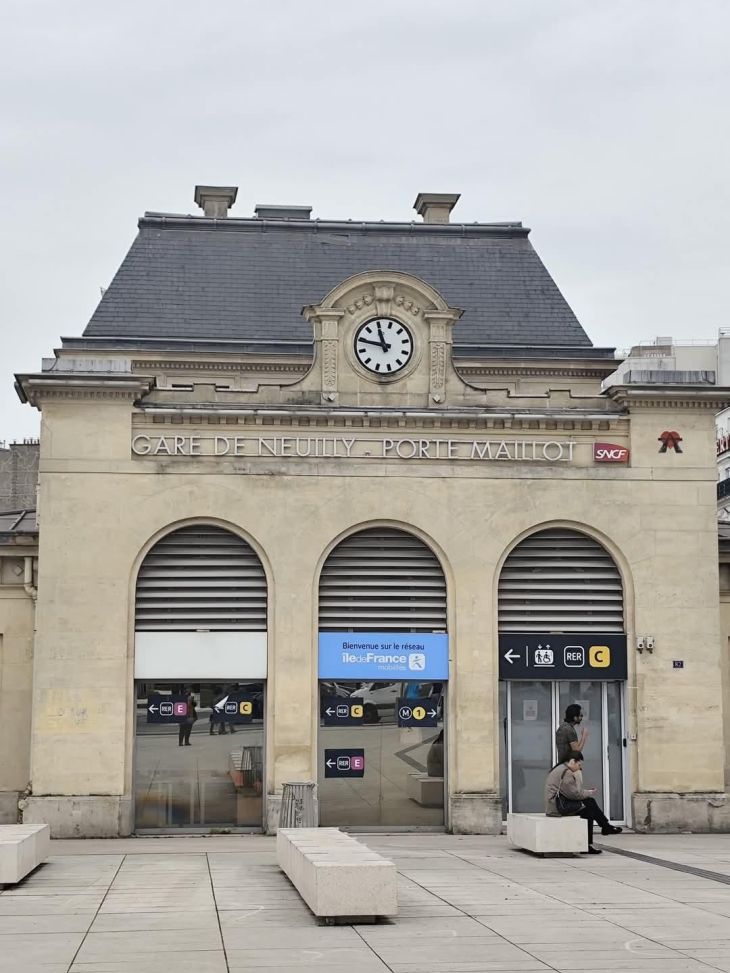 The gare de Neuilly – Porte Maillot or the Neuilly-Porte Maillot station is located in the 17éme arrondissement of Paris. It is served by trains on RER lines C and E. The historic station building is located on the eastern edge of the City of Neuilly-sur-Seine,(Hauts de Seine dept 92) on the edge of the Place de la Porte-Maillot, from which it takes its name. The platforms for RER line C are located between the two tracks of Boulevard Pereire, built in 1988, east of Boulevard Gouvion-Saint-Cyr and the Palais des Congrès. The new station for RER line E is located beneath the Place de la Porte-Maillot. The Auteuil rail line and its stations were built on the initiative of the Pereire brothers, founders of the Compagnie du chemin de fer de Paris à Saint-Germain de Laye; they opened for service on May 2, 1854. The station was one of seven stations on the 8 km long line from Pont-Cardinet station to Auteuil-Boulogne station, also known as the Auteuil rail line. In 1867, it was incorporated into the Petite Ceinture line. This line closed on January 6, 1985, to allow its partial transformation and to constitute one of the branches of the RER C. Neuilly – Porte Maillot station reopened in this new context on September 25, 1988. Since May 6, 2024, the station has been served by RER line E.