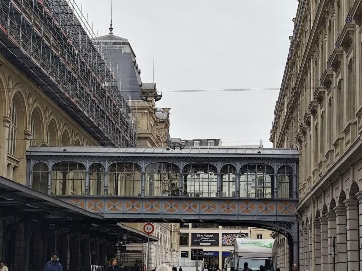 A train station is inevitably a setting steeped in history. And the Gare Saint-Lazare delights anyone with a passion for old buildings, architecture, or artistic movements. It was my first working train station coming to worked in Paris ! The passerelle Eugénie aka the Passerelle de l’Impératrice, with its windows painted by a former railway worker, incredible glass roofs and monumental staircase, is one of the secret features of the Gare Saint-Lazare, which is revealed, notably during Heritage Days. But anyone can see it from the outside, from the forecourt. This closed footbridge, which connects the station to the current Hilton Paris Opéra Hotel (stayed on business convention here), was used by the bourgeoisie and other prestigious and international travelers when taking the train and boat was still a luxury. These travelers had the advantage, upon getting off their train, of being able to go directly to their hotel, which was called Terminus at the time and belonged to the SNCF without having to cross the crowds in the street. The Passerelle is associated with Empress Eugénie, who is said to have used it. Completely redesigned and renovated by the renowned Maison de Gastronomie, Le Dalloyau Saint-Lazare resto, on the second floor, the 200 m² restaurant has around 100 seats and welcomes Parisians and travelers from around the world every day from breakfast to dinner, including lunch and afternoon tea. On one of the establishment’s walls, the artist Bishop created a large, colorful, and quirky modern fresco that perfectly blends in with the footbridge’s Eiffel-style design.