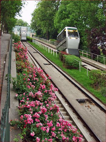 The Funicular of Montmartre (see post) located in the 18éme arrondissement or district of Paris, It has been an automatic inclined lift since 1991 comprising two cabins allowing you to climb to the top of the Montmartre hill and thus access the Sacré-Coeur Basilica (see post) without having to take the staircase of 222 steps ! . It officially opened in July 1900 ; until then, the Basilica was difficult to access, because there were few cars, and the steep slopes of the Montmartre hill made the ascent difficult in a horse-drawn carriage. But it was only in 1900 that it was inaugurated, even before the construction of the Paris metro network , It was completely renovated in 1935 and then transformed in 1991. It is 108 meters long, it climbs the 36 meters drop in less than 1,5 minutes ! Precisely , it is located between place Saint-Pierre and the place Suzanne-Valadon for the lower station, and rue du Cardinal-Dubois for the upper station, it runs along rue Foyatier which is in fact only made up of a staircase of 222 steps with landings.(done this too ).