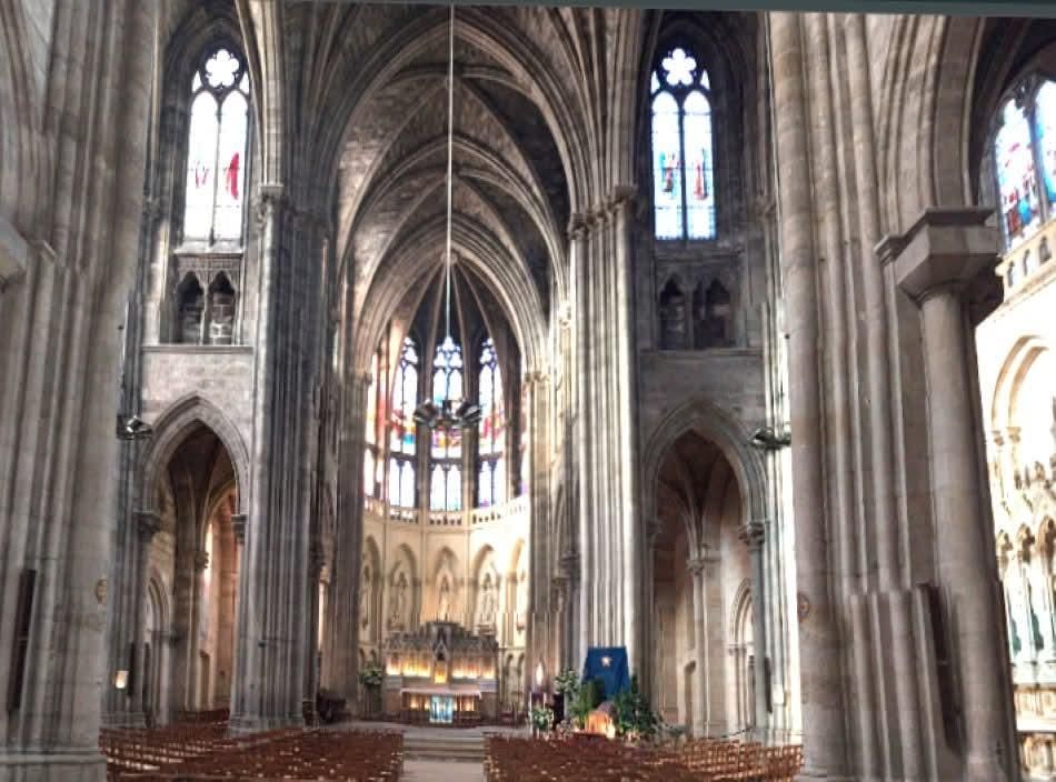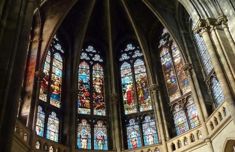 The choir of the Church has a white marble high altar. The base of the high altar is divided into five compartments with a gold damask background, which display scenes from the life of Saint Louis. The apse and the stained-glass windows depicting the Life of Jesus by the Nicolas Lorin workshop, Chartres, 1879. They are enriched with a gallery of angels on the first level. Jesus’ Entry into Jerusalem; Peter’s First Communion; The Resurrection; The Pilgrims of Emmaus; and the Pentecost. The apse and the high altar in the sanctuary. The belt of statues under a canopy, topped by large stained-glass windows depicting the life of Jesus, gives the apse a certain elegance. The transept arms are on two levels, unlike the nave and the choir. Here, the north liturgical arm with its altarpiece and large stained-glass window by the Henri Feur workshop. Altar of the south liturgical arm of the transept: six saints surround the Virgin of 1880. The Sacred Heart surrounded by six saints.