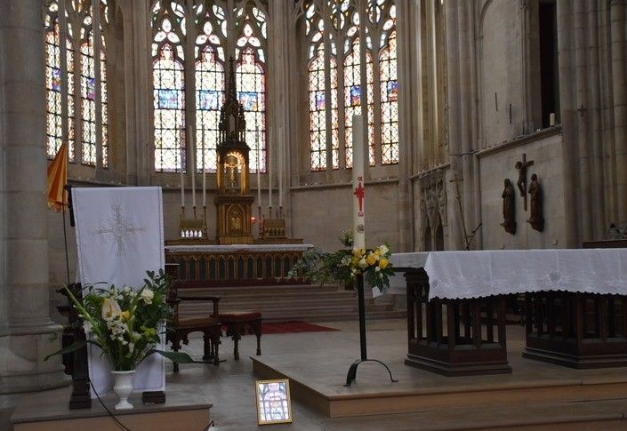 There is, also, one of the most beautiful washbasins of the 13C with a scene of the coronation of the Virgin as well as the two patrons of the basilica, on the right Cardinal Ancher and on the left Pope Urban IV. The north chapel with its stained glass window of the Visitation from the 13C. The south chapel with its stained-glass window of Mary with Grapes,
