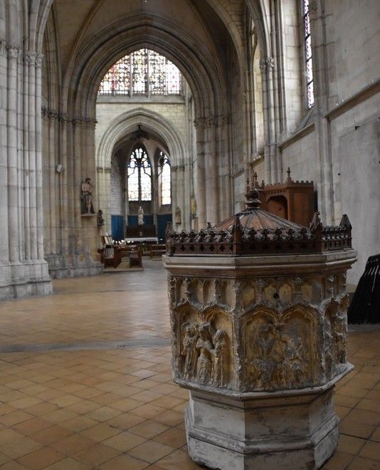 The impressive Baptismal font 15C acquired during the demolition of the church of Saint-Jacques-aux-Nonnains by a master mason from Troyes named Chanté, who sold it to a baker to make a well curb in the courtyard of his house. It was dug up and served this purpose until 1849, when the owner sold his house to live on rue Notre-Dame. On leaving his old home, he gave it to the church of Saint-Urbain, his new parish, where it was returned to its former purpose. You see at the end the Chapel of the Virgin,