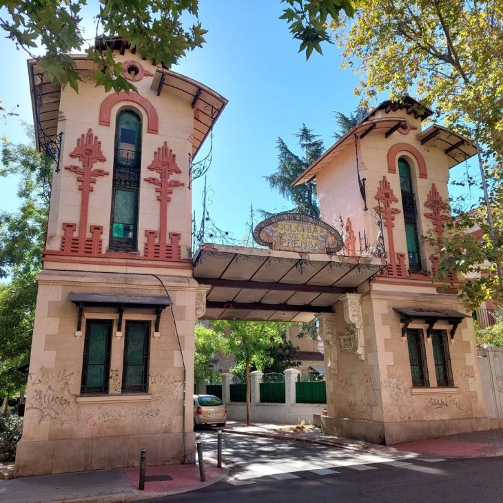 The Puerta de la Colonia de la Prensa is located in the Carabanchel district and it hides a surprising art-deco neighborhood built between 1913 and 1916. This colony, made for writers and journalists from the Los Cincuenta or the fifties professional association in order to develop the land between Lower and Upper Carabanchel, was made up of homes and small hotels in the modernist style with a garden. It has its main entrance at numbers 61 and 63 Calle Eugenia de Montijo, it is still possible to enjoy its spectacular entrance with a guard post with two splendid modernist control posts turrets, which was also used to halt the tramway and act as a telephone booth, and some of the original 65 chalets. You will see a gate with two towers with brackets holding a marquee decorated with drooping flowers. In the early days. The small modernist houses were designed by Mario López Blanco and true to its name, Colonia de la Prensa was built on the initiative of a group of journalists as a place of welcome for wealthy families wishing to escape the hustle and bustle of the city. They came to relax in the many small hotels and houses. The first stone of the Colony of the Press was done in 1913 by the king Alfonso XIII, it was estimated in 1915 as the construction of this singular puerta or gate of great architectural interests, was located at the beginning of the ancient street called Calle del Mediodía or midday street.