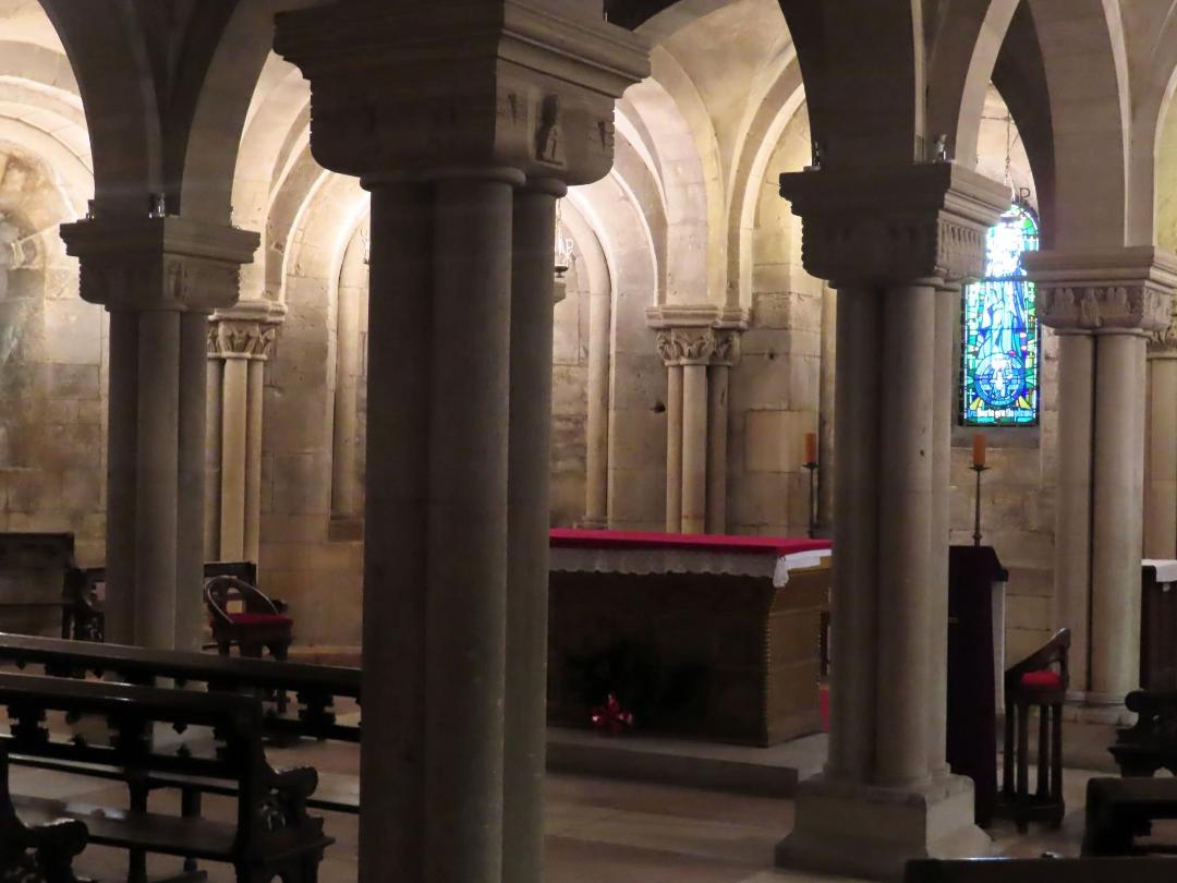 The crypt was built in the 12C. It consists of a central hall crypt and two lateral annex crypts serving as access points. It was filled in after the fire of 1755 and rediscovered after the Great War or WWI thanks to German bombing. It was restored in 1935, and the capitals of the 13 pillars of the crypt were created. The sculptures depict scenes from the religious life of the town and the Battle of Verdun in 1916. The statue of the Virgin Mary was sculpted in 1932. The vaults, walls, and transverse arches of the south wing of the crypt are painted with 15C frescoes. These latter depict religious subjects such as the Annunciation, the Presentation of Jesus in the Temple, the Nativity, the Visitation of the Virgin Mary, and the Last Judgment. The Resurrection is recounted in eight small paintings on a transverse arch.