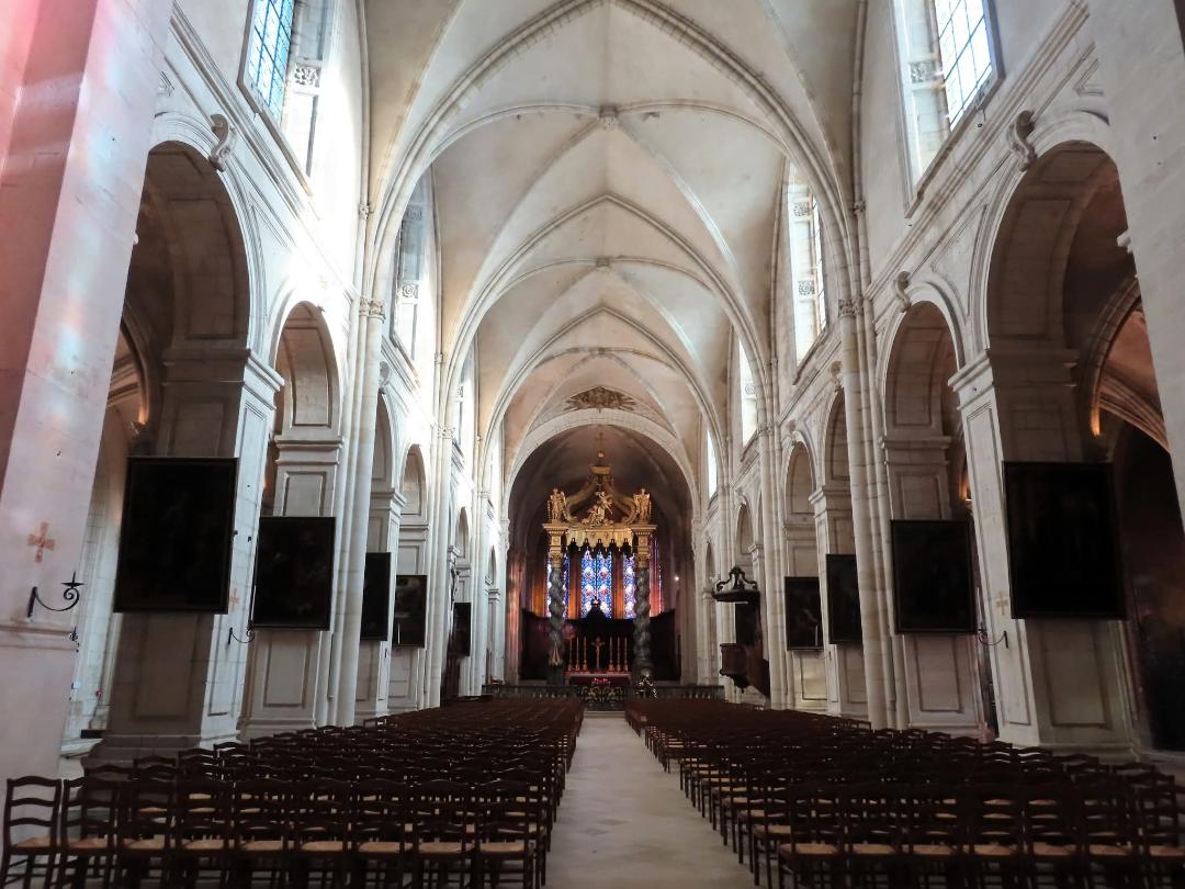 The cathedral is 94 meters long. It is 12 meters wide at the nave and 37 meters wide at the transepts. The vault is 19 meters high. The eight-bay nave with side aisles has nine Gothic side chapels. The western choir, or “old choir,” has a flat apse, while the eastern choir, or “new choir,” has a seven-sided apse built in the 12C and then heightened in the 14C. The baldachin installed at the crossing of the transept and the eastern choir is a smaller replica of the one in St. Peter’s Basilica in Rome. Sculpted in 1760, it is made of marble, stucco, gilded wood, and ironwork. The choir balustrade is inspired by that of the Luxembourg Gardens in Paris. The ensemble is intended to draw the viewer’s attention to a symbol of Baroque art and to make them forget the cathedral’s medieval image.